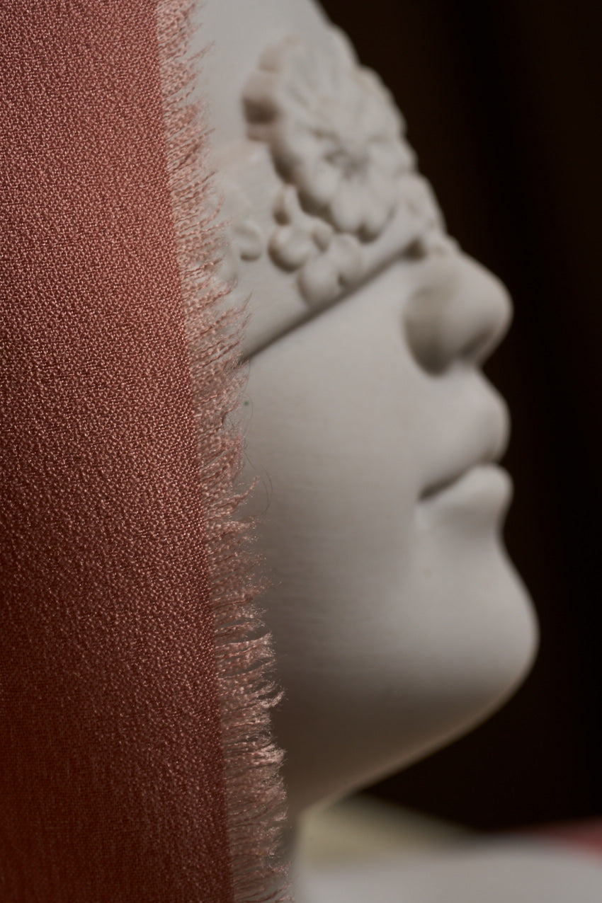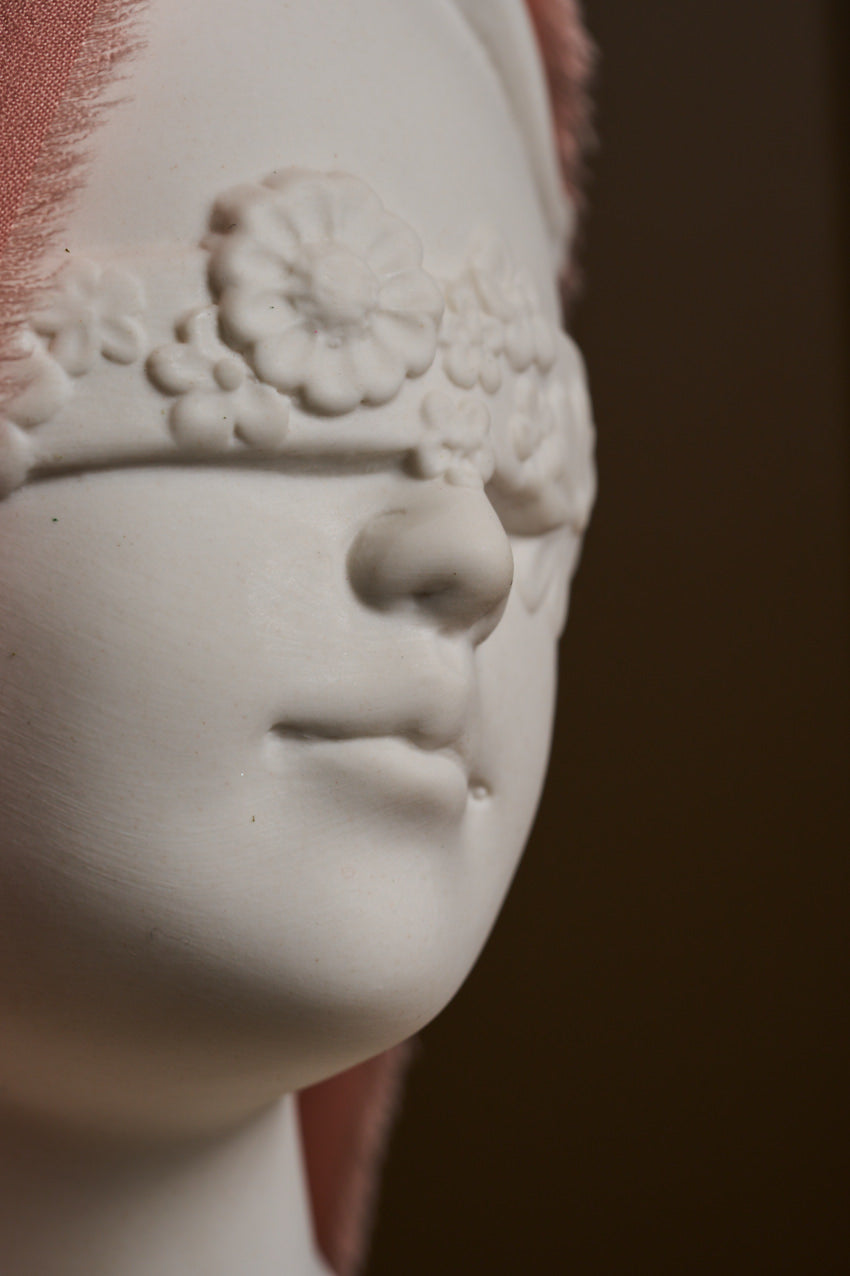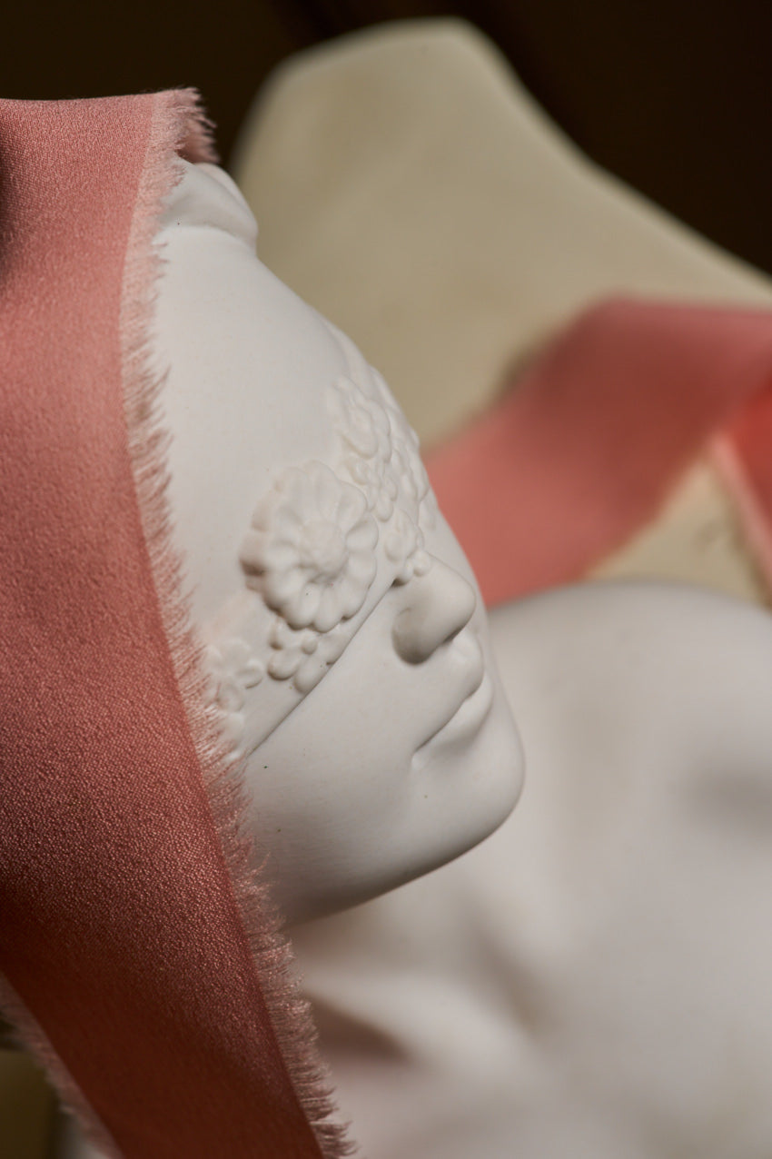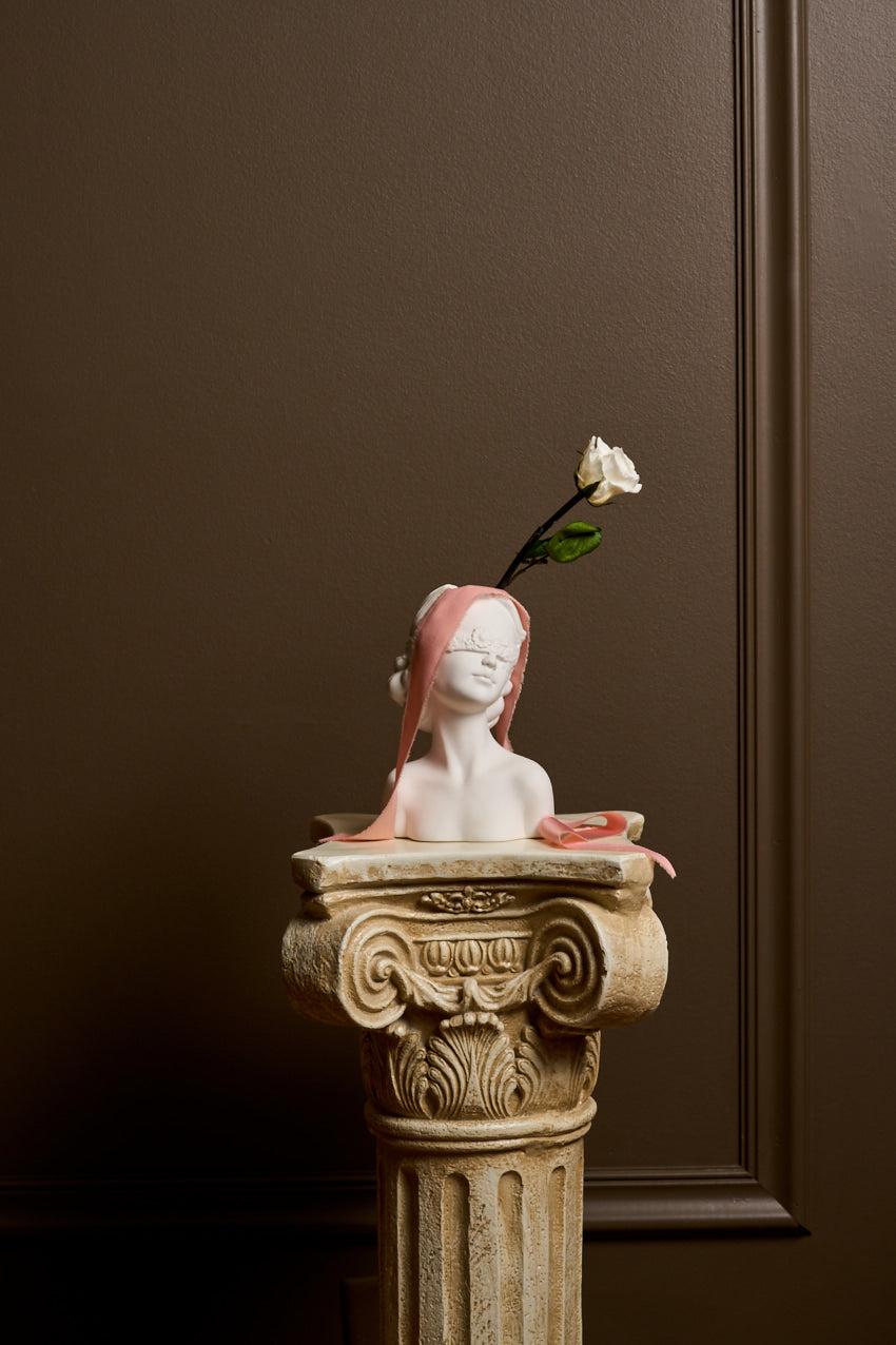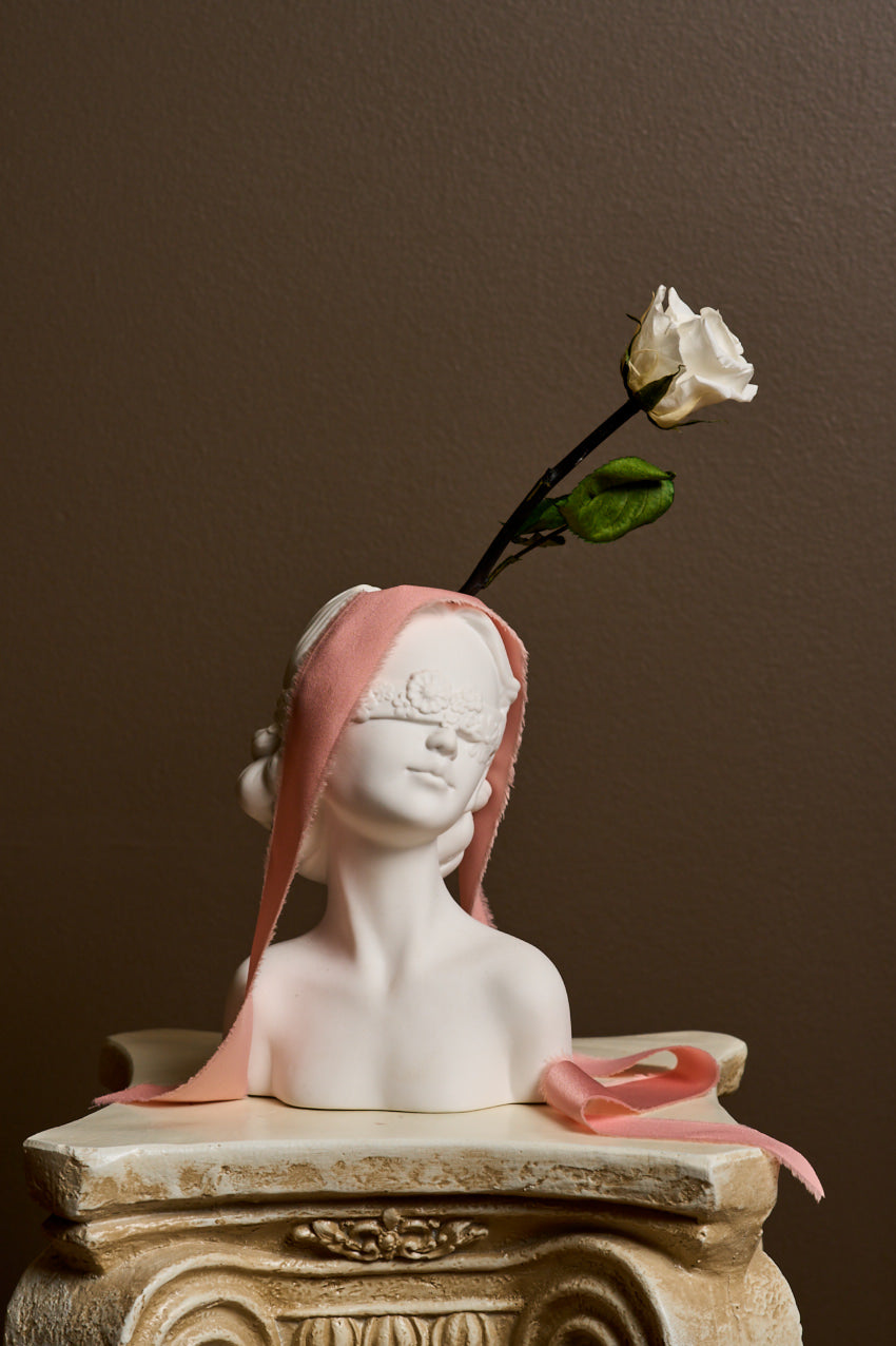 Introducing Adeline — a sculptural silhouette of a woman, her eyes gently veiled by roses. At the center: a single long-stemmed white rose, pristine and serene, held with intention. A blush ribbon cascades down like a whispered memory, while a delicate butterfly rests nearby — mid-thought, mid-flight.