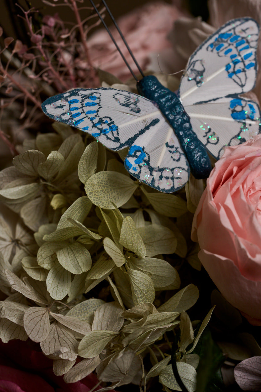 Introducing Alma — an abundant, earth-kissed arrangement that feels like a warm embrace from someone who always knows what to say. Overflowing with over ten assorted blush blooms, oregano-hued hydrangea, soft ivy tendrils, and the grounding presence of a single peacock feather, Alma is both wild and wise. A butterfly lingers nearby — not just for beauty, but for grace in motion.