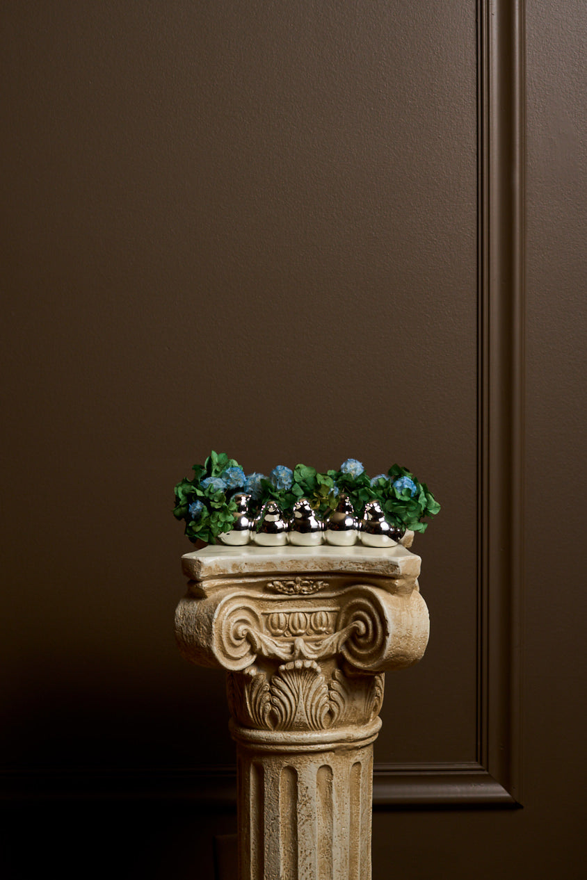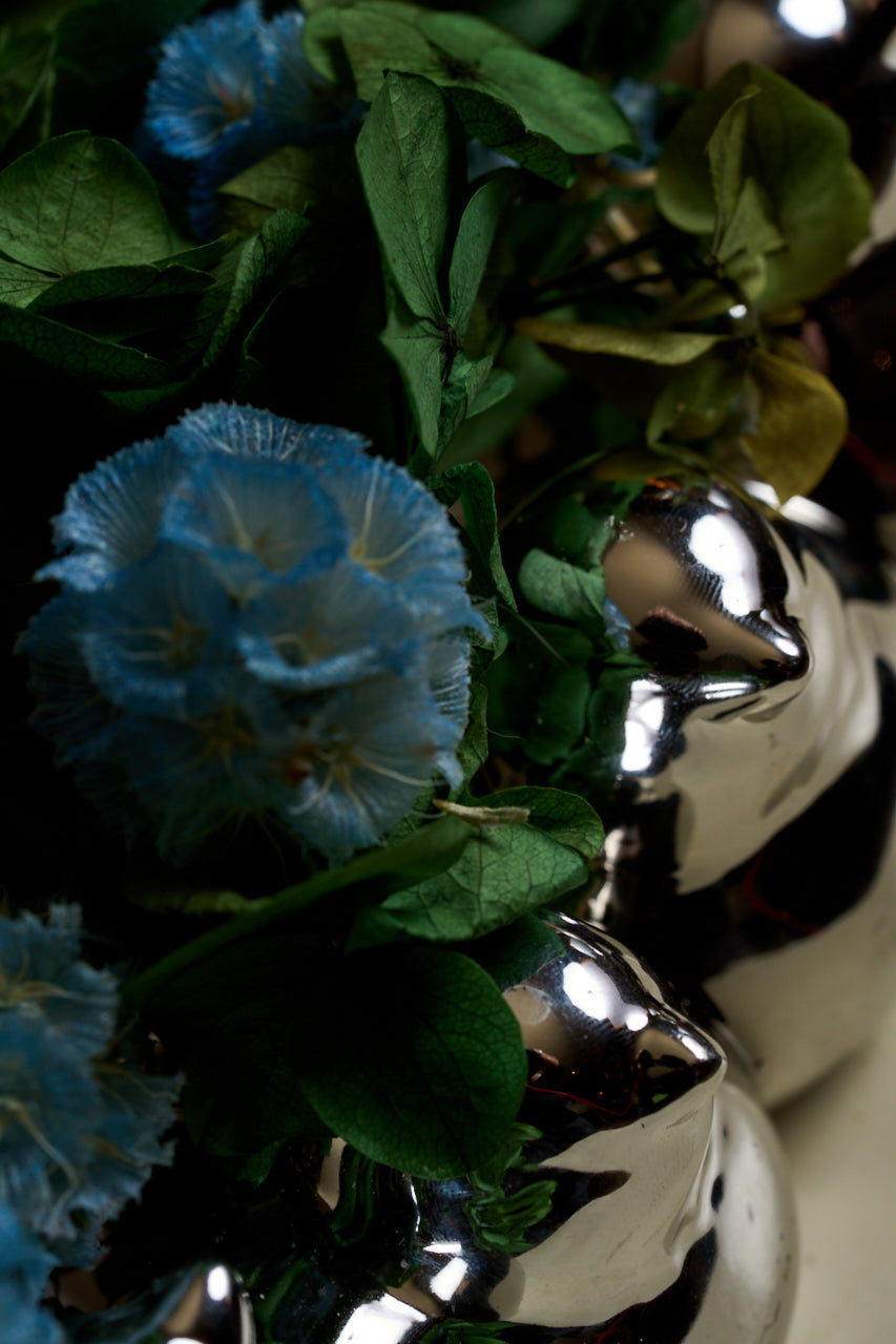 Introducing Bird’s Nest — Silver — a dreamy arrangement of cloud-blue hydrangea and playful billy balls, nestled gently into a sculptural nest form. Icy in tone but warm in presence, this piece feels like a breath of winter air through an open window, or a secret kept in linen and sky.