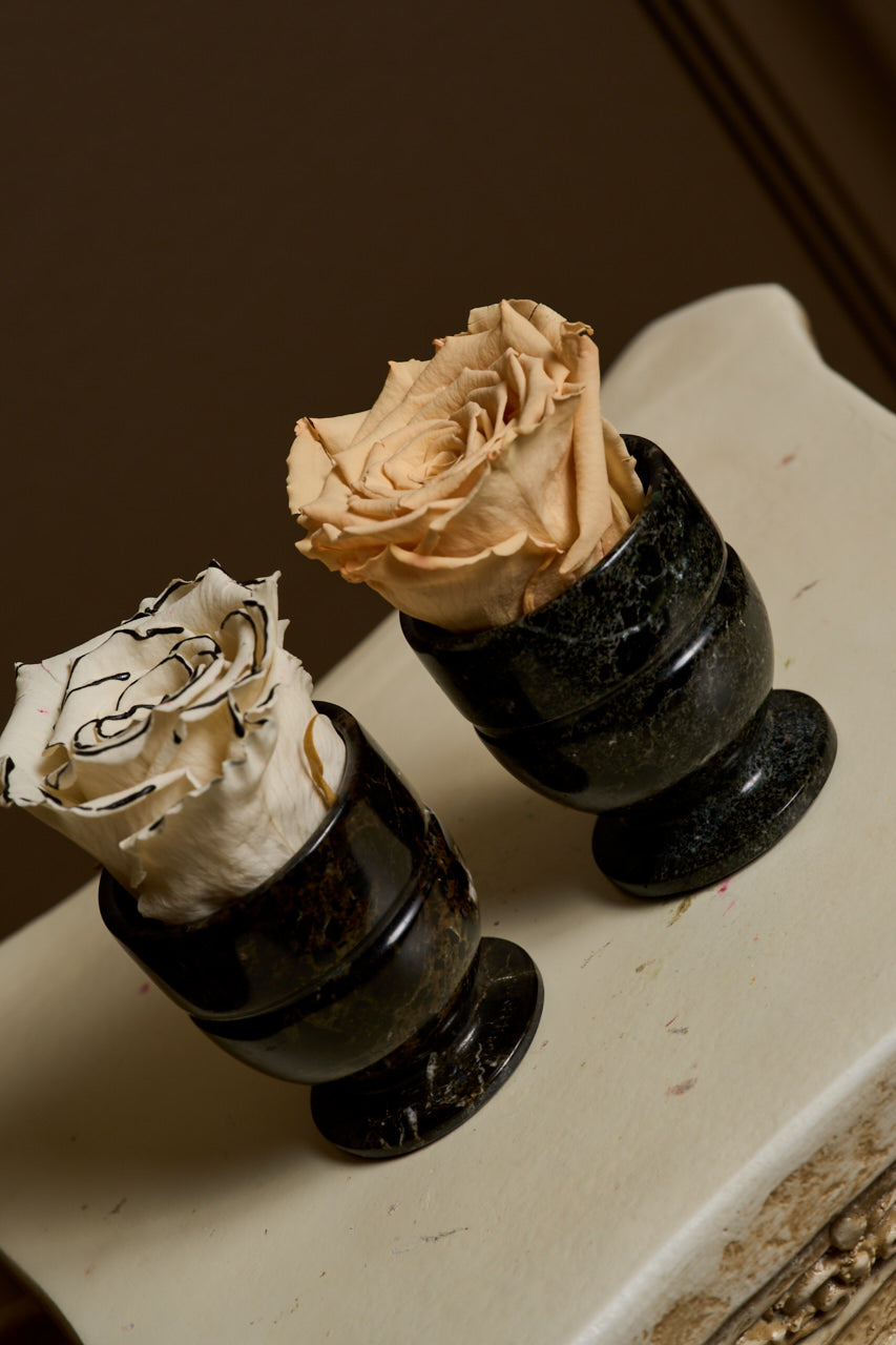 Introducing the Black Bloomlet — a miniature floral moment that feels like poetry whispered in candlelight. Nestled inside this inky little egg cup is a single neutral rose in café au lait tones, preserved at its peak. Soft yet sculptural, this bloom carries the quiet weight of elegance with just a flicker of rebellion.