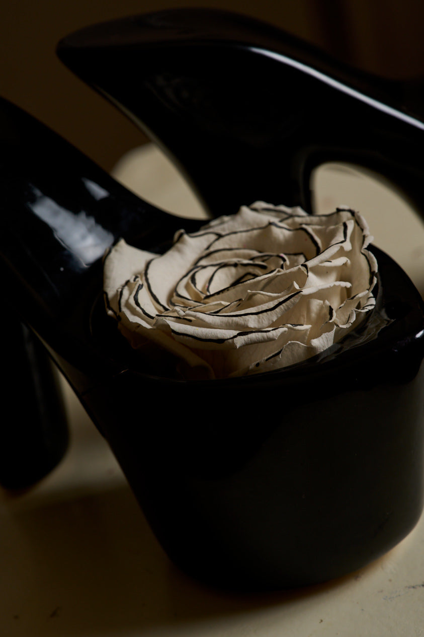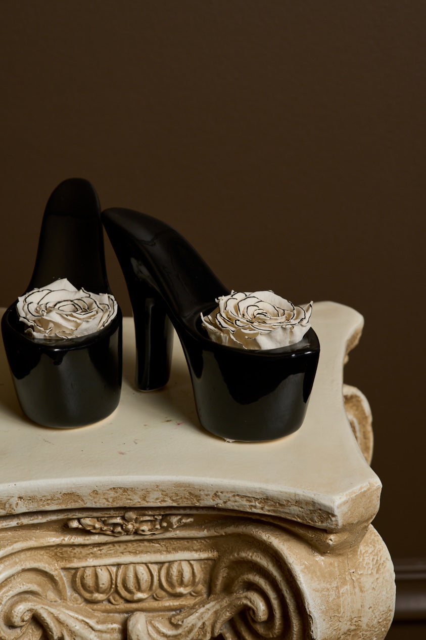 Introducing Black Heels — a preserved floral arrangement that proves you don’t need much to make a statement. With two pristine white tuxedo roses nestled in a sleek, stiletto-shaped vessel, this piece carries the quiet power of restraint—and the undeniable allure of confidence.