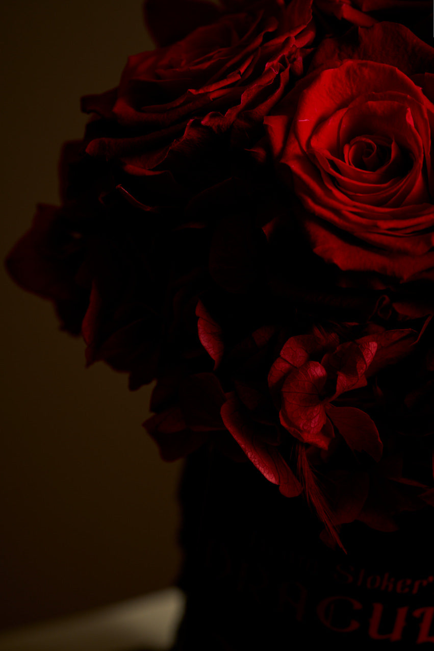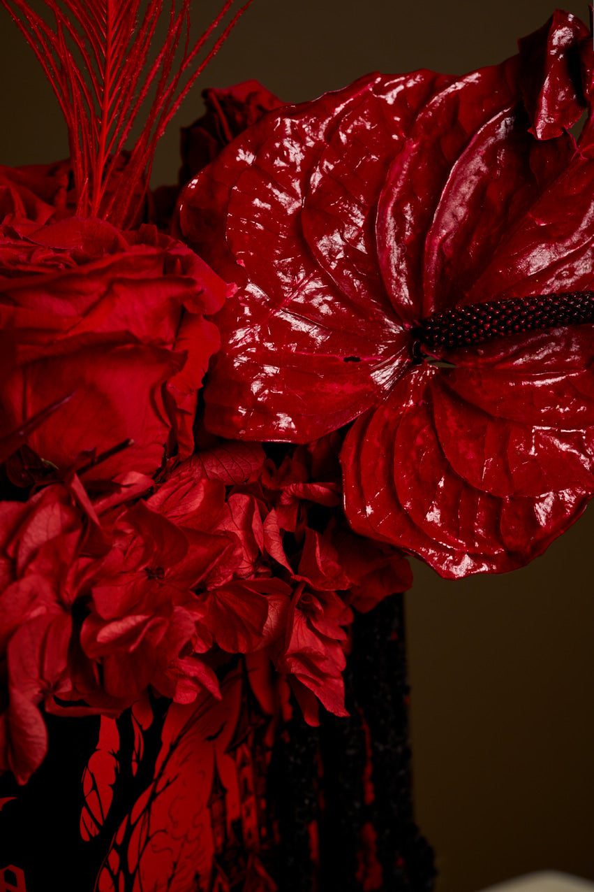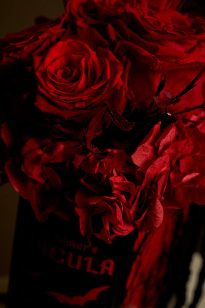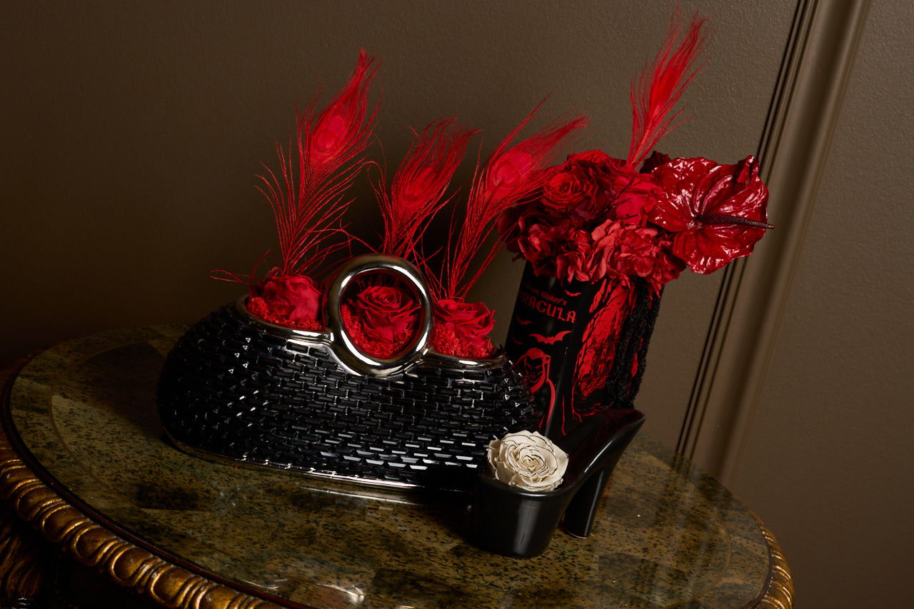 This bold arrangement features deep red hydrangea, cascading black amaranthus, seven lush seasonal red roses, a striking red anthurium, and three shimmering peacock feathers, all resting against a backdrop of soft moss. Each element is chosen to evoke the richness of Gothic art—the romance of darkness, the grandeur of movement, the timelessness of mystery.