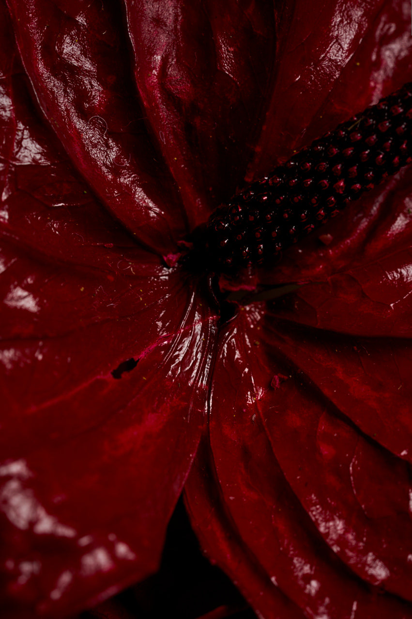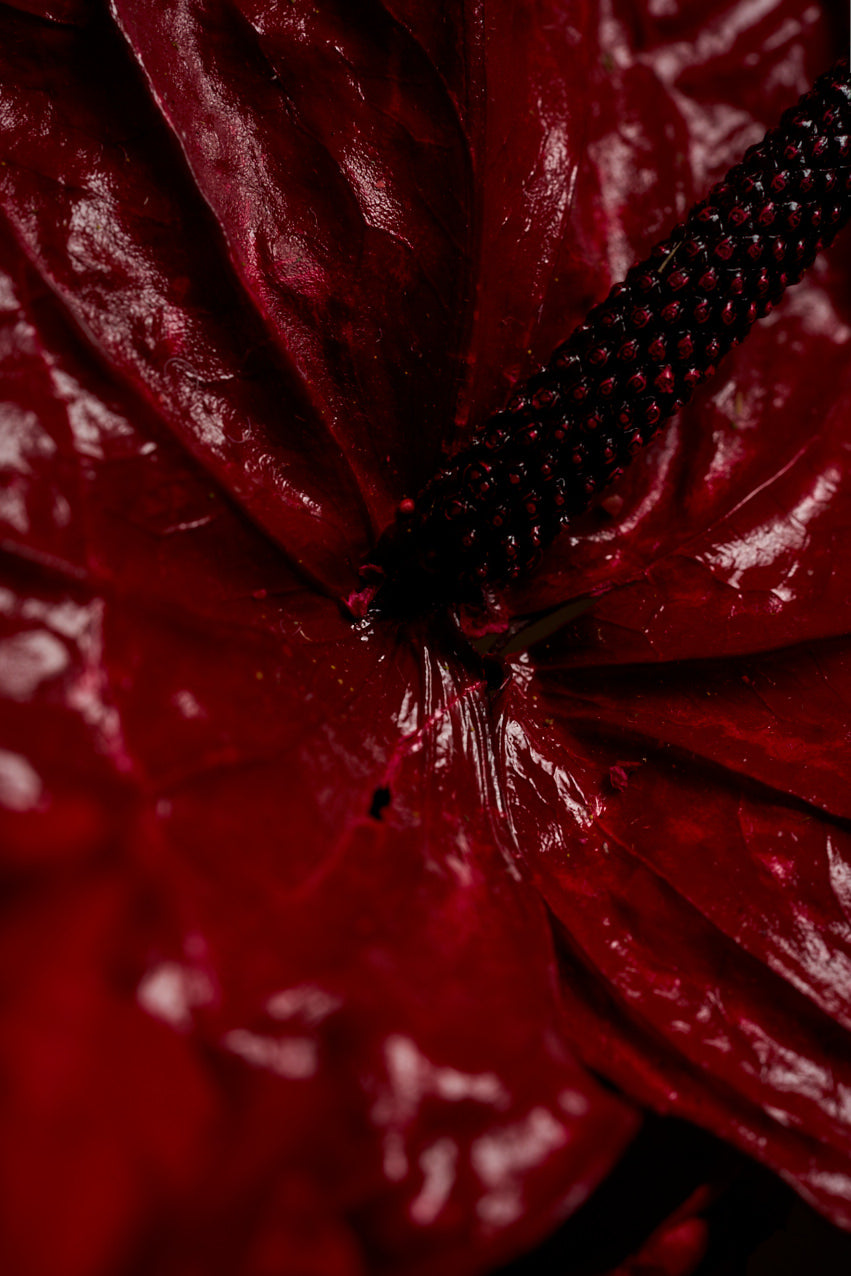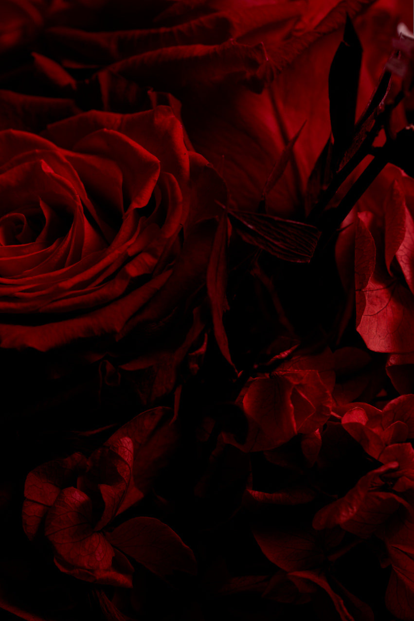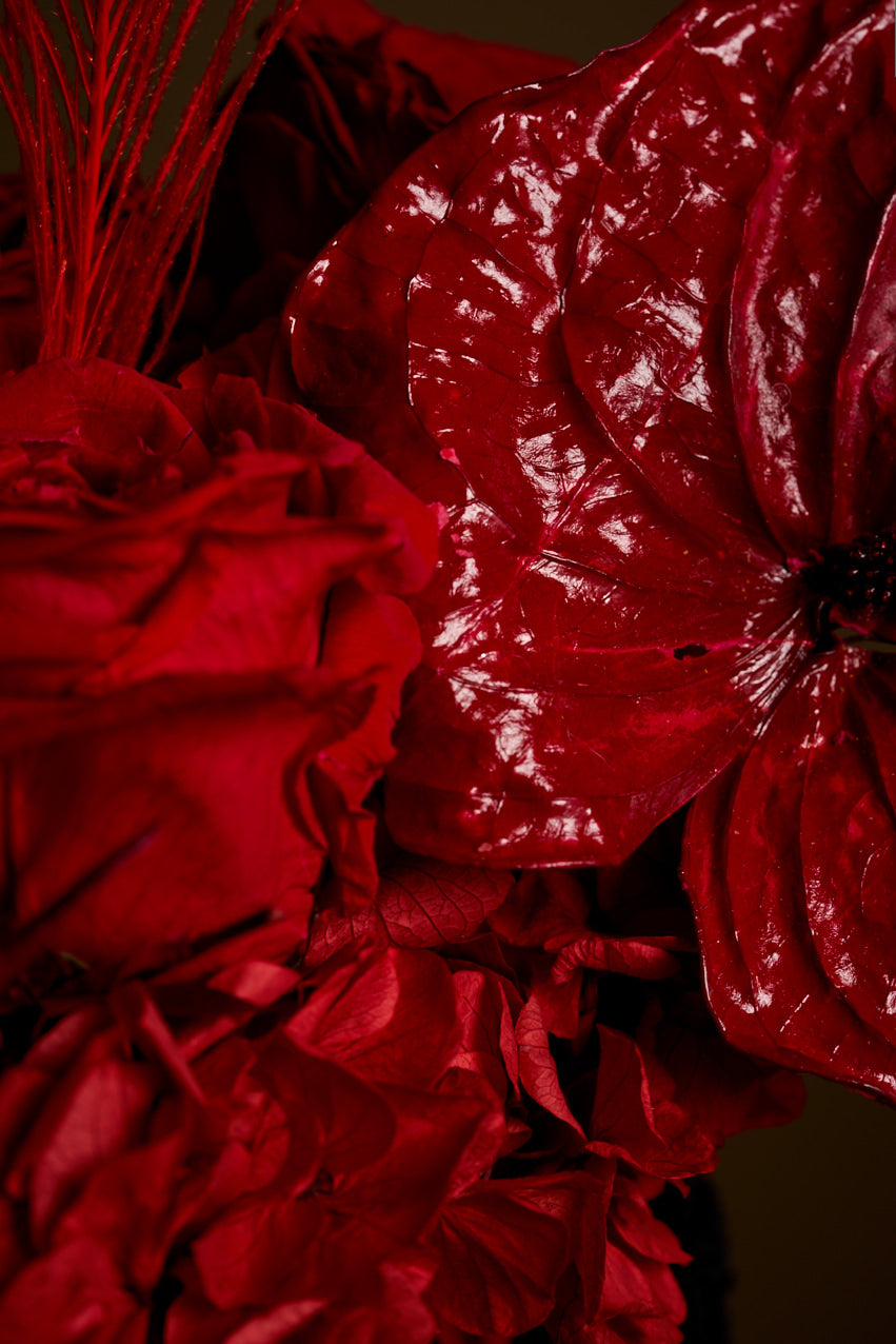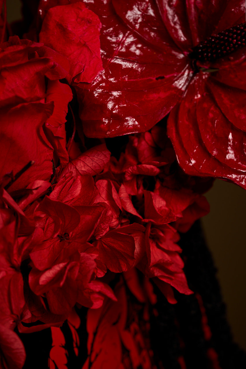 This bold arrangement features deep red hydrangea, cascading black amaranthus, seven lush seasonal red roses, a striking red anthurium, and three shimmering peacock feathers, all resting against a backdrop of soft moss. Each element is chosen to evoke the richness of Gothic art—the romance of darkness, the grandeur of movement, the timelessness of mystery.