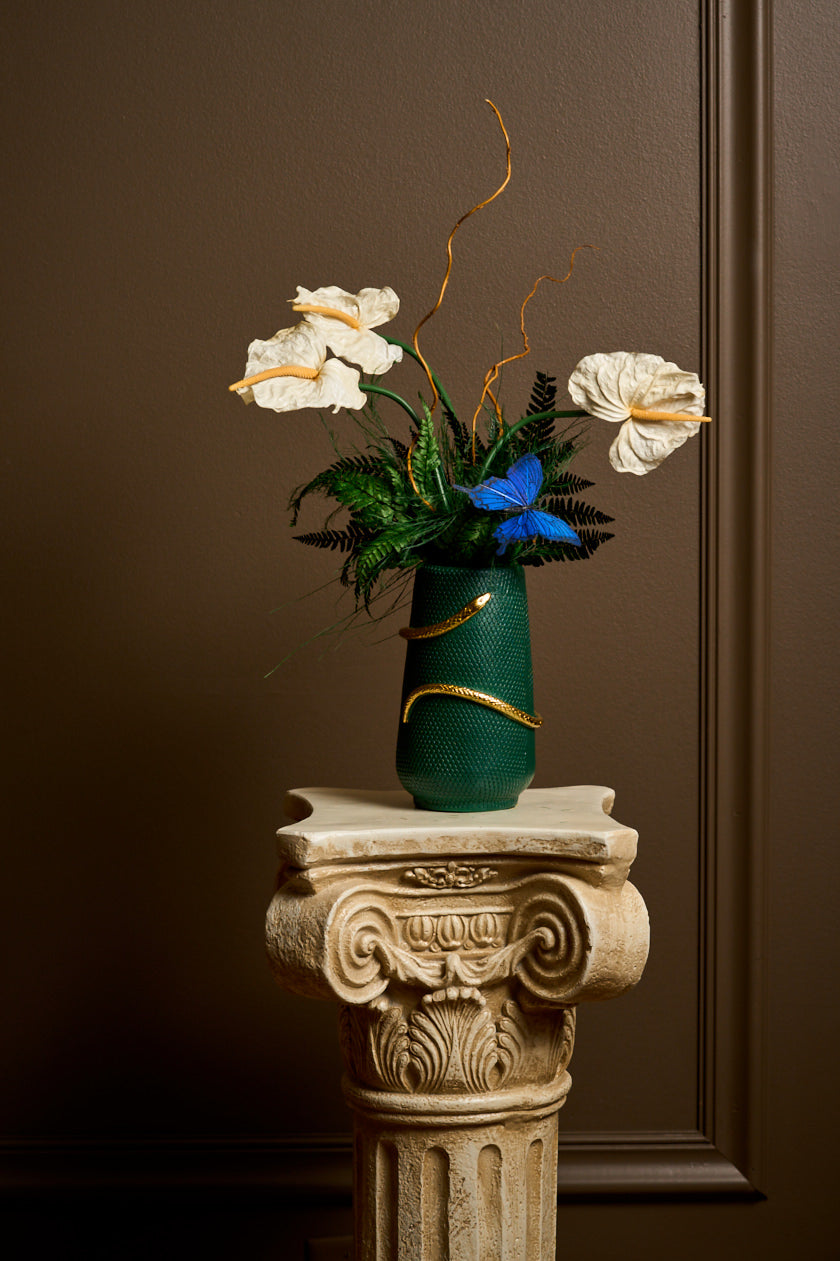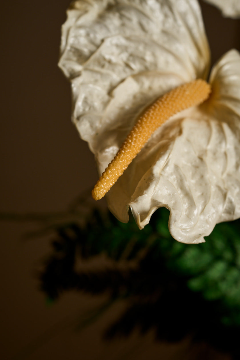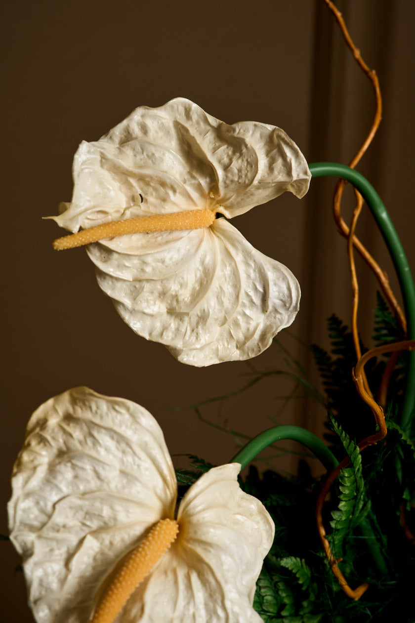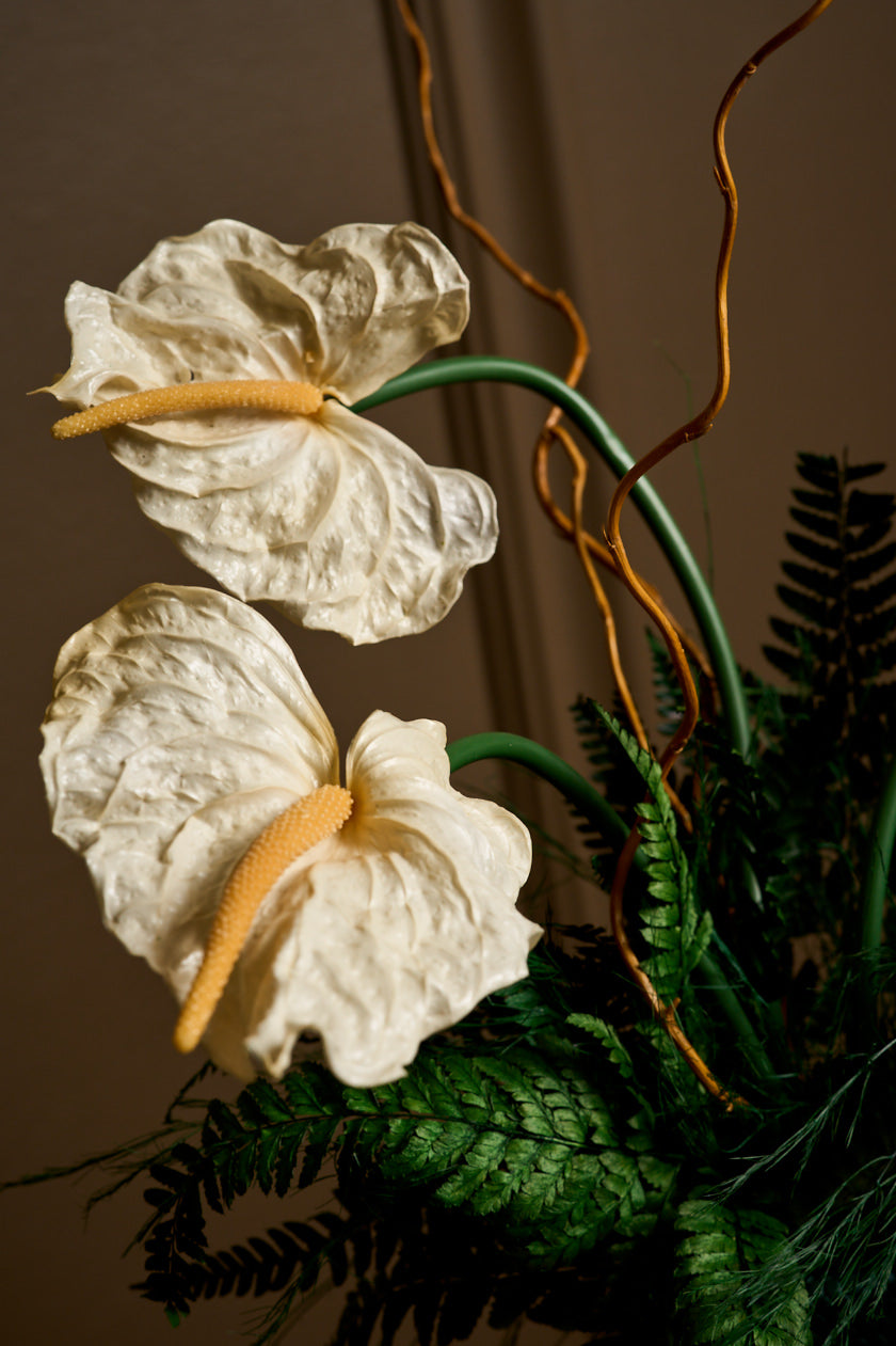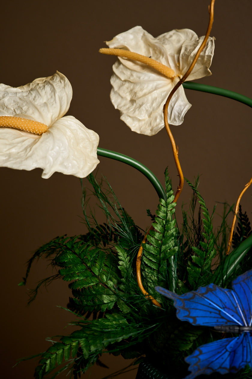 Introducing Eve — a strikingly simple yet deeply symbolic arrangement featuring three cream-colored anthuriums, gracefully arched bleach curly willow, and a single butterfly in still flight. She’s minimal, but not modest. Serene, but far from simple.