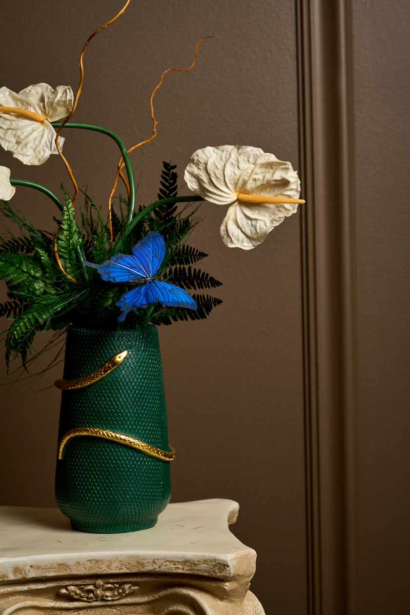 Each anthurium stands like a question — open, luminous, and alive. The willow curls gently, like a thought just beginning to form. And the butterfly? A soft reminder that transformation doesn’t need fanfare — only presence.