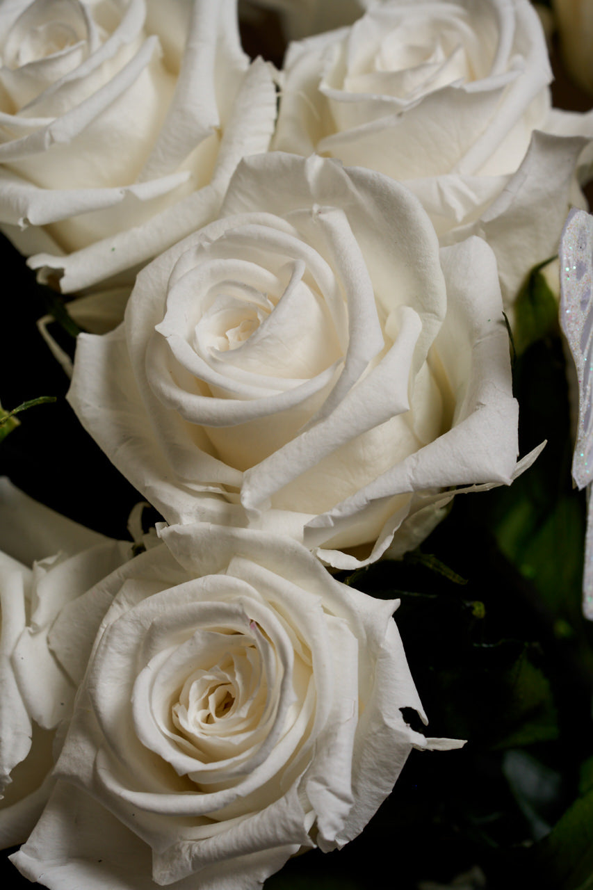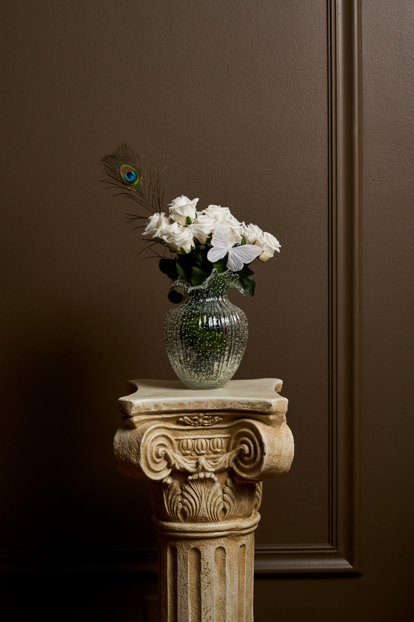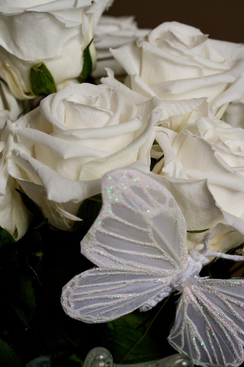 Introducing Glow — a truly radiant arrangement housed in a vase that softly glows in the dark, like moonlight bottled. Inside, twelve long-stemmed white roses reach upward in ethereal stillness, surrounded by trailing ivy, peacock feathers, a tri-color plume, and a butterfly caught mid-dream.