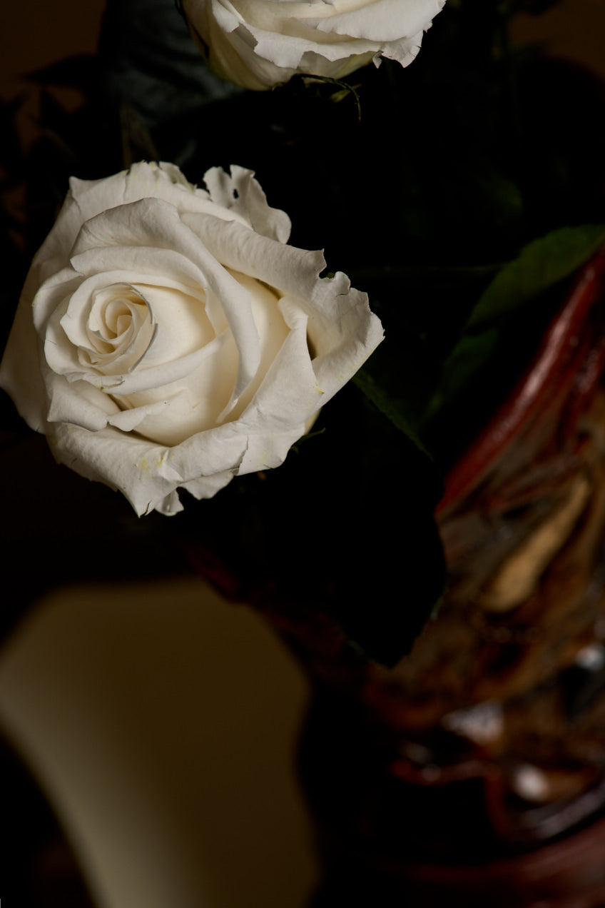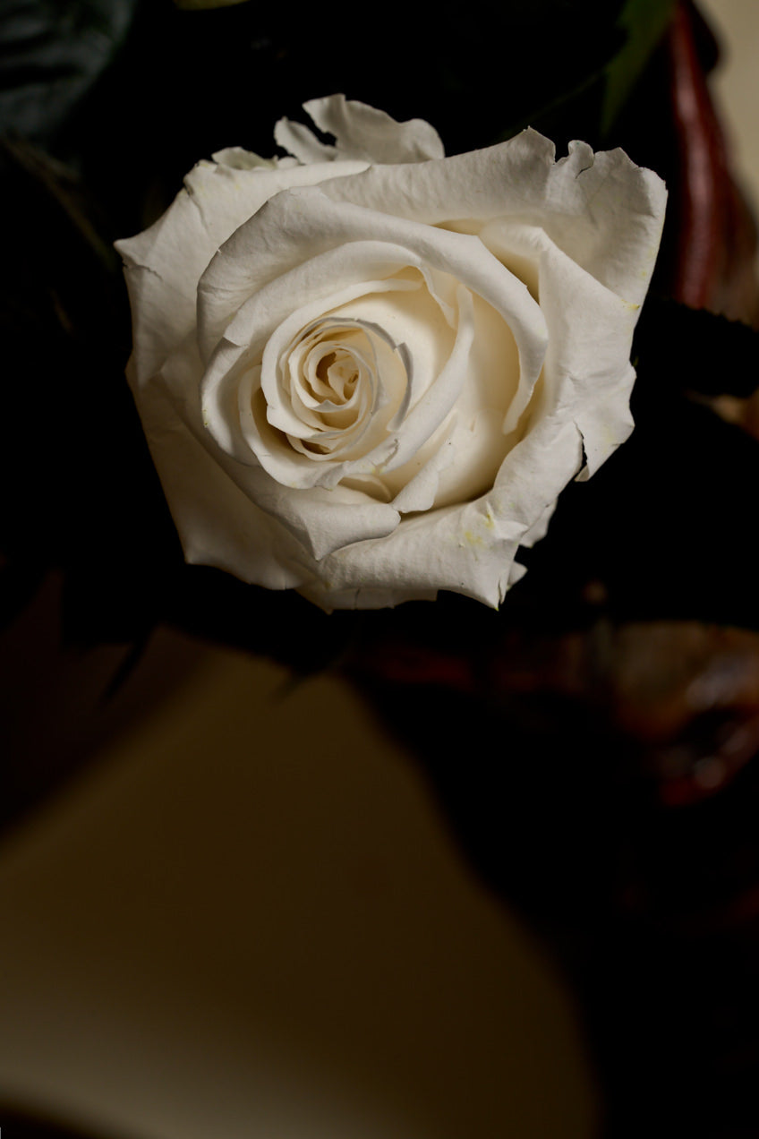 This composition includes three long-stemmed white roses, dark green Italian ruscus, a brown feather, a ringtail feather, and a monarch butterfly resting like a quiet emblem of transformation. Every detail speaks of resilience, tradition, and the kind of integrity that can’t be manufactured—only lived.