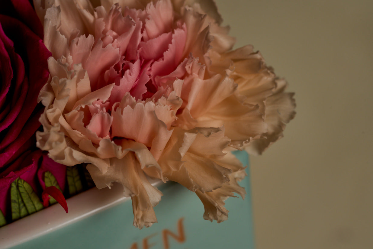 This piece features two soft carnations, a vivid fuchsia rose, and a grounding brown feather, gathered together in a gentle embrace of color and contrast. Each element reflects the strength found in simplicity—the small, steady joys that shape a life well-loved.