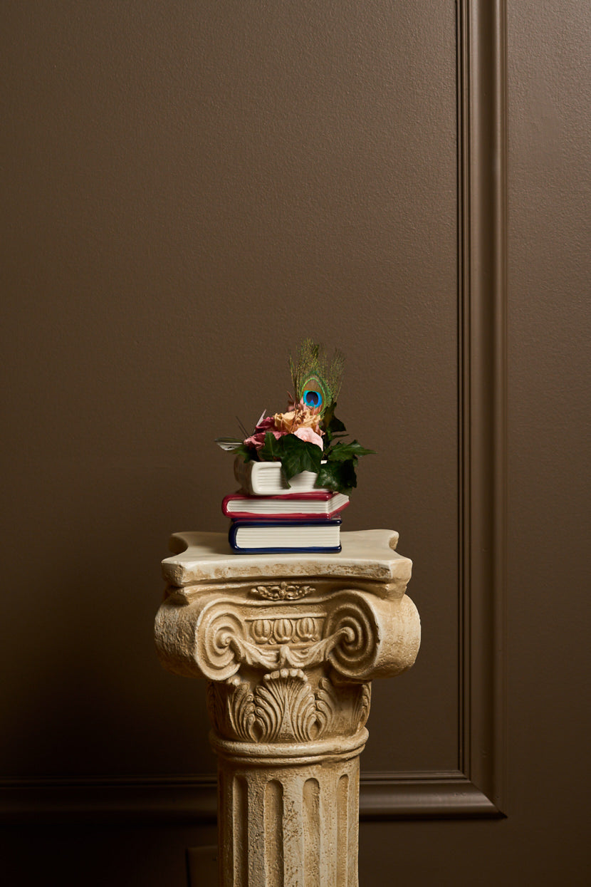 This composition gathers nine seasonal roses and peonies, soft oregano-colored hydrangea, trailing ivy, delicate ferns, sprigs of lavender, a monarch butterfly poised in quiet defiance, and a scattering of small teal feathers. Every element speaks to the art of contradiction—grace meeting stubbornness, beauty wrapped in boldness.