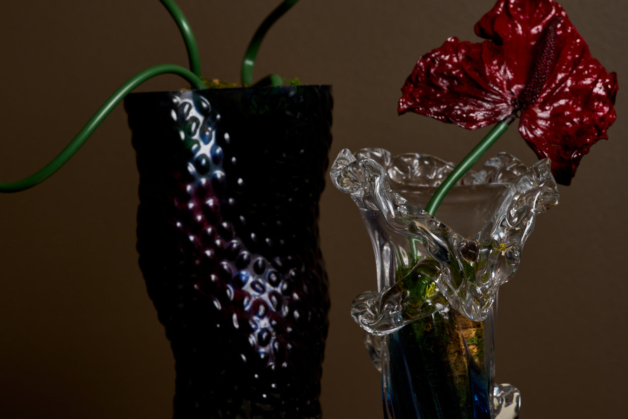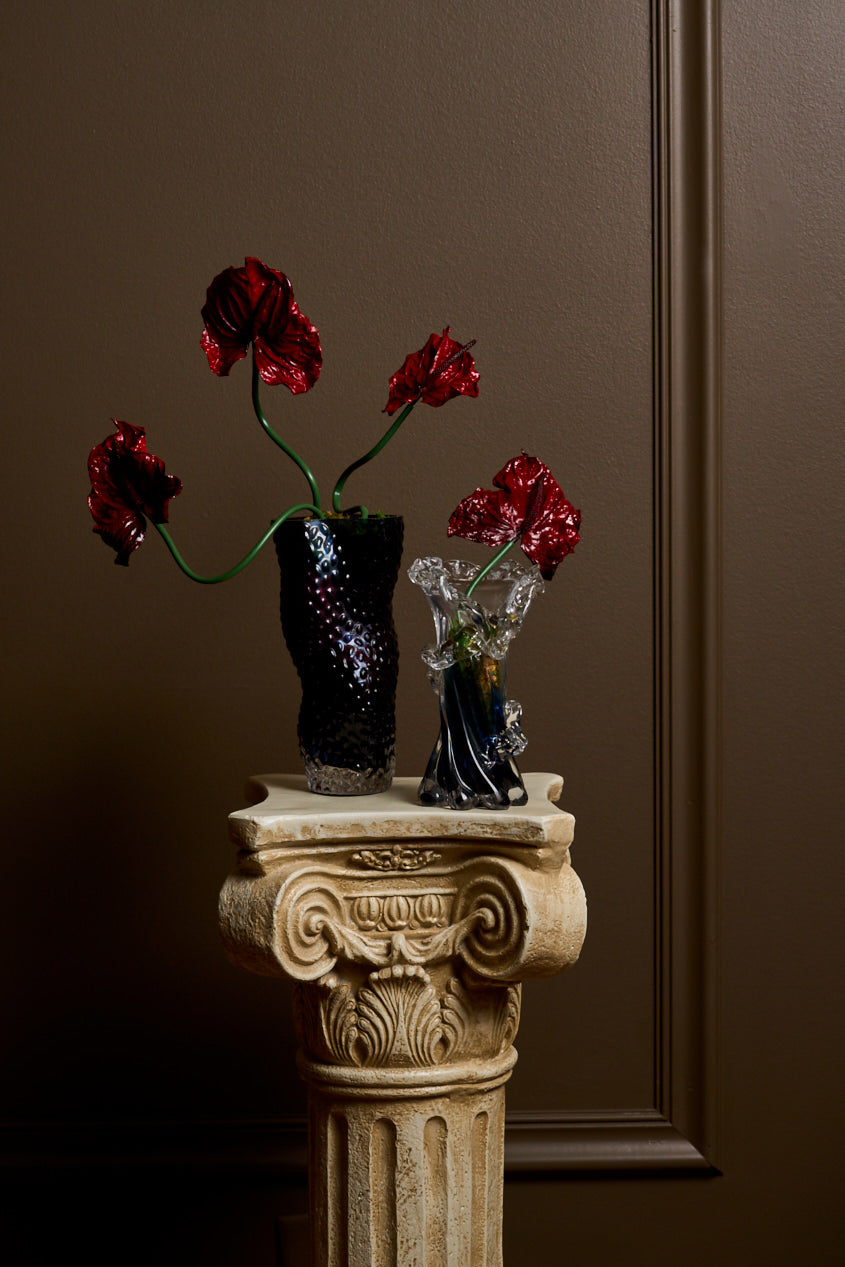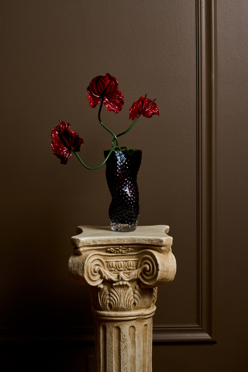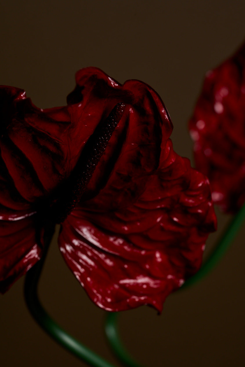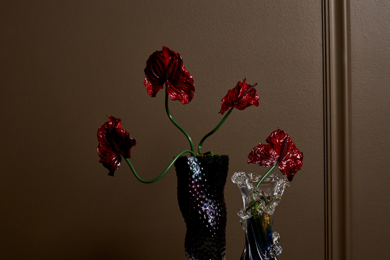 Introducing Tall Blue — a striking vase in a rich, cerulean hue, rising with quiet confidence. Inside, three vivid red anthuriums arc with intention — sculptural, bold, and utterly unapologetic.