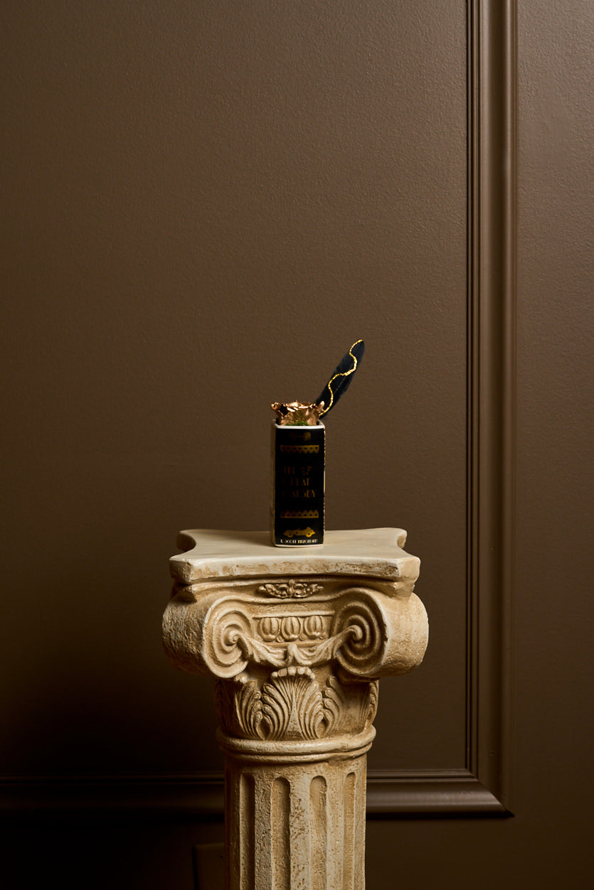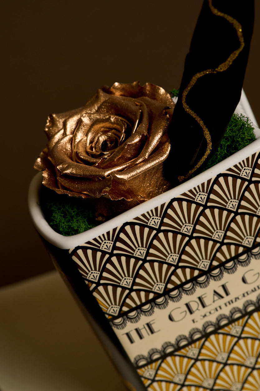 A single gold rose takes center stage, framed by lush green moss, a bold black feather, and a sunlit lemon slice—each detail a nod to the lavishness, fragility, and bittersweet beauty woven through Gatsby’s world.