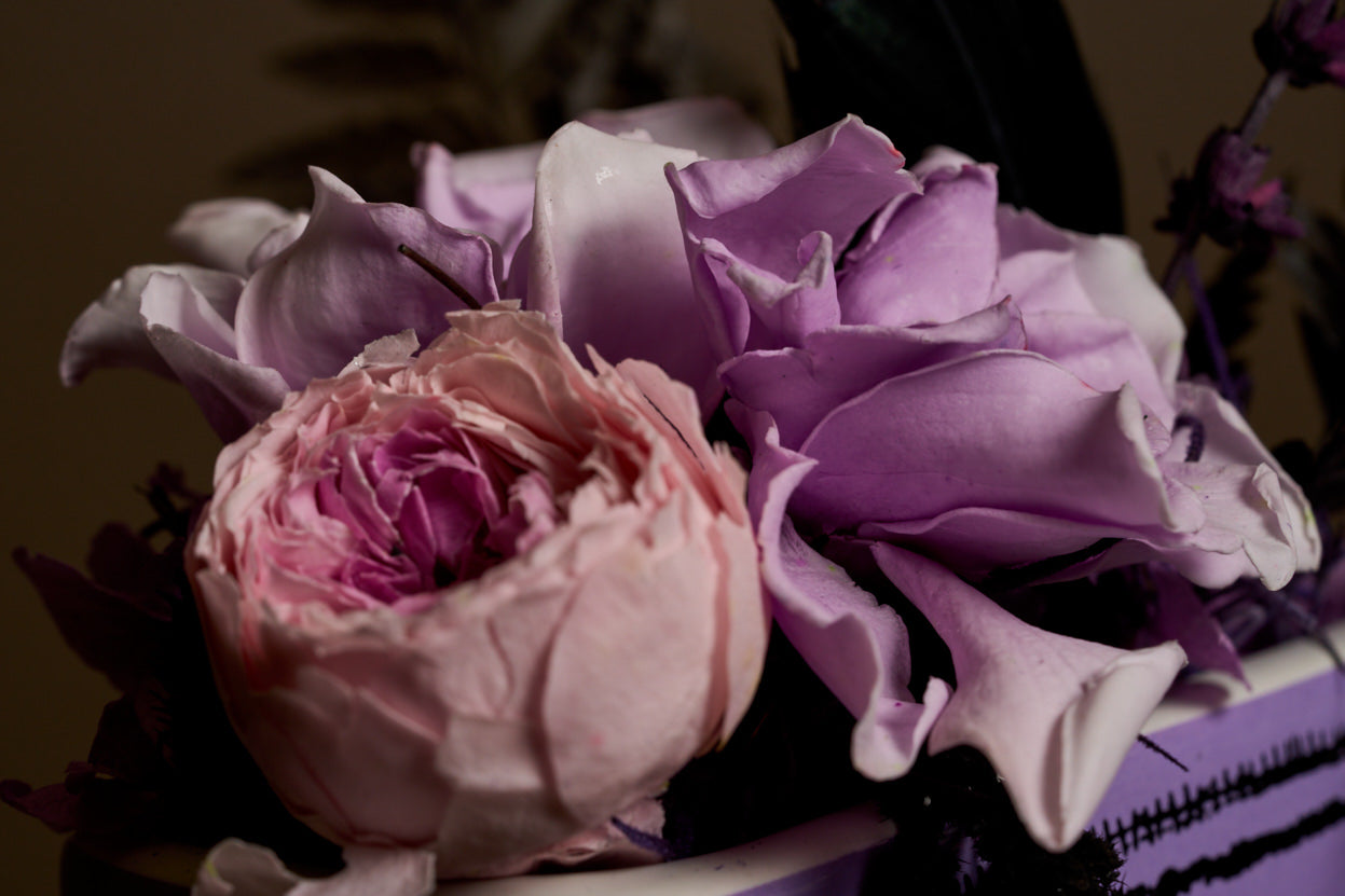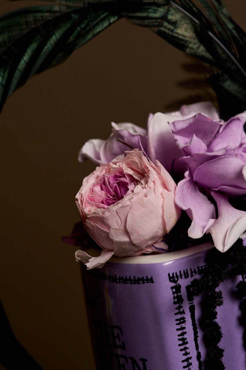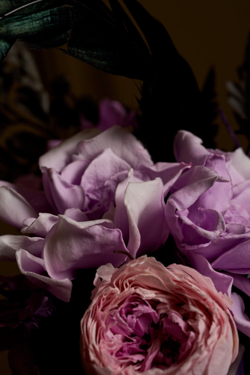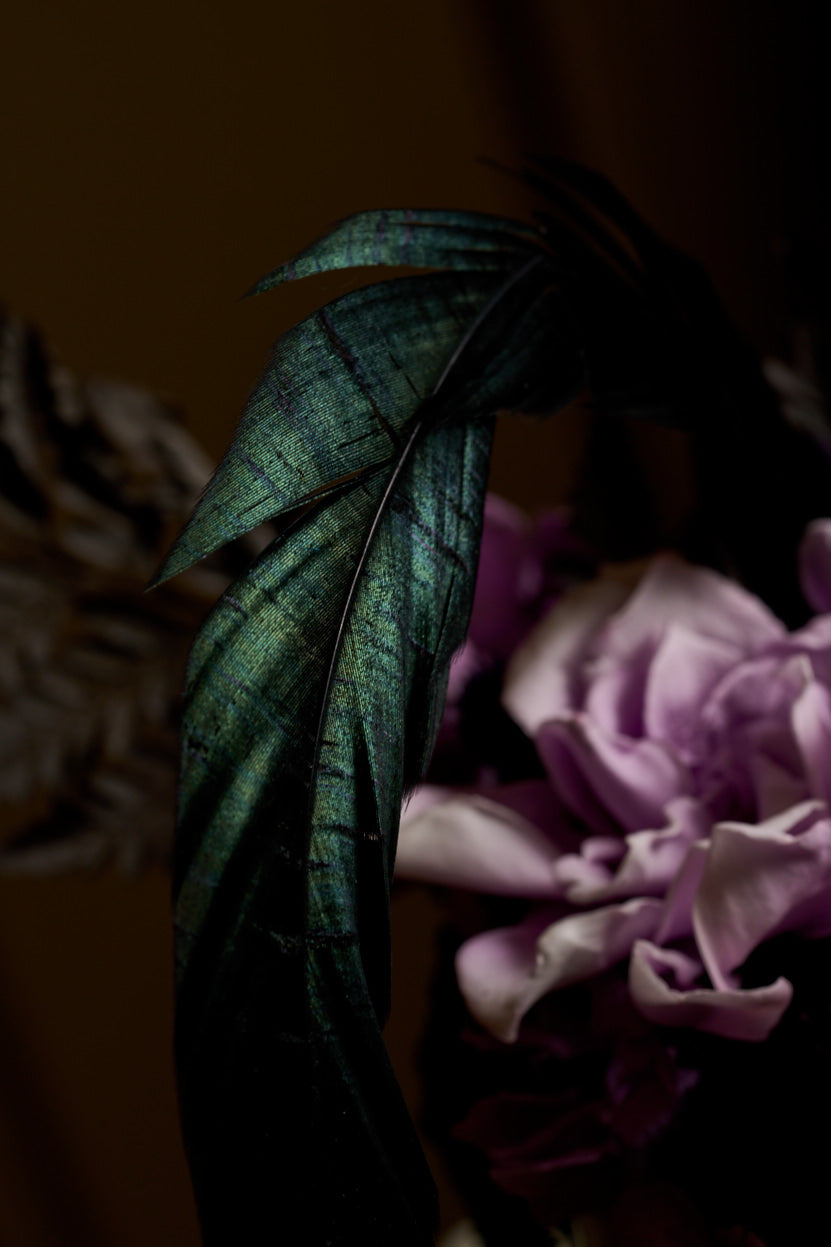 This composition gathers lush purple hydrangea, cascading black amaranthus, three purple bi-color gardenias, a purple bi-color rose, soft lavender, and a single sweeping black feather. Each element hums with depth, mystery, and the kind of haunting beauty that leaves its mark long after the first glance.