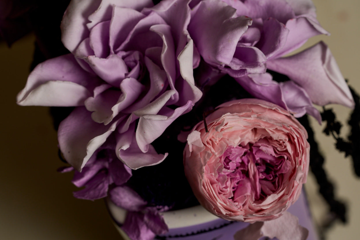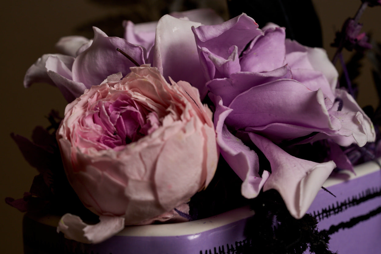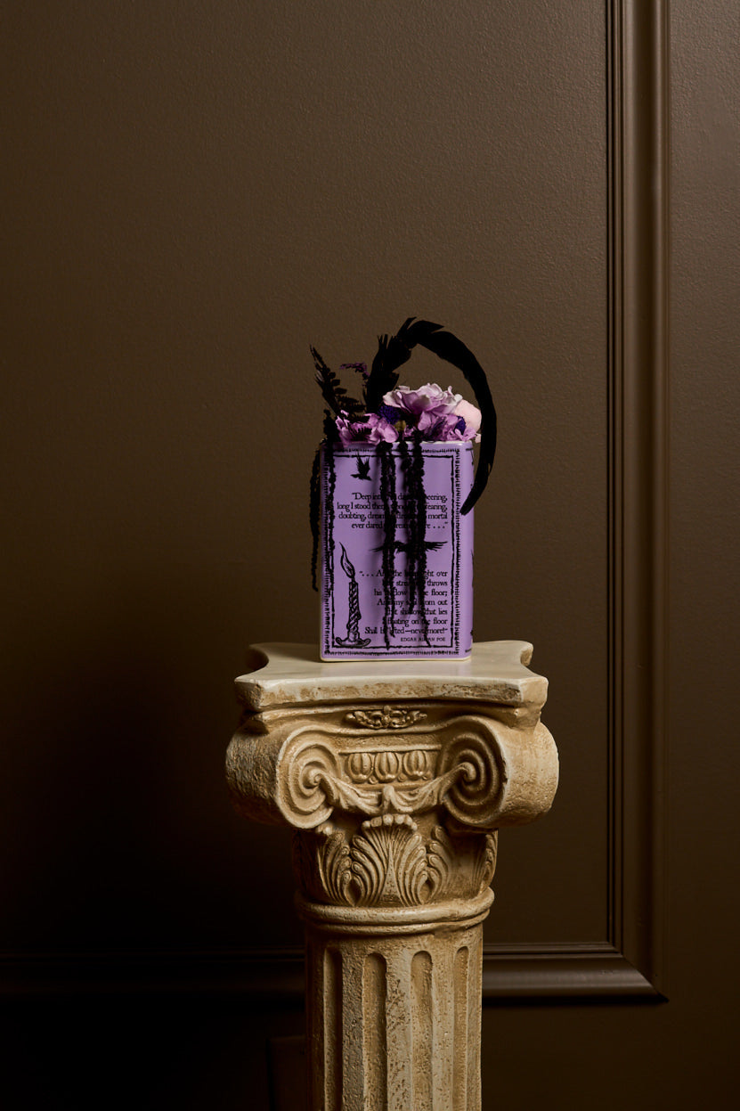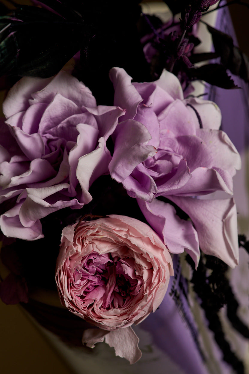 This composition gathers lush purple hydrangea, cascading black amaranthus, three purple bi-color gardenias, a purple bi-color rose, soft lavender, and a single sweeping black feather. Each element hums with depth, mystery, and the kind of haunting beauty that leaves its mark long after the first glance.