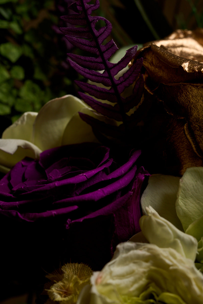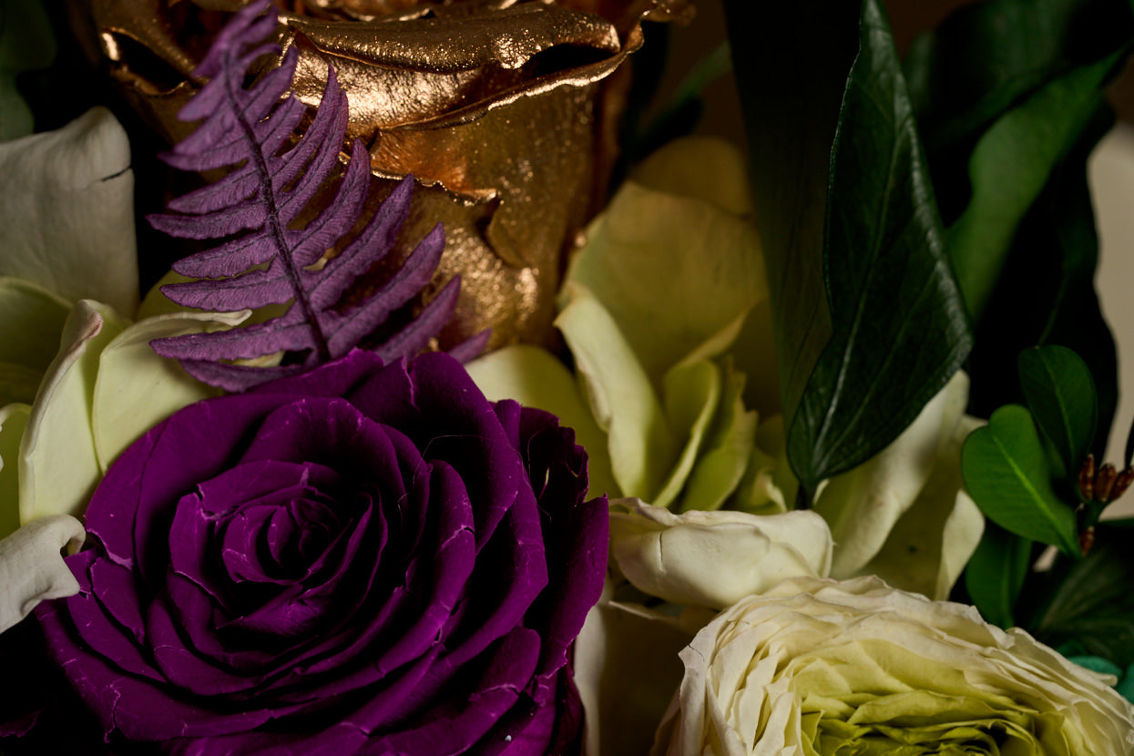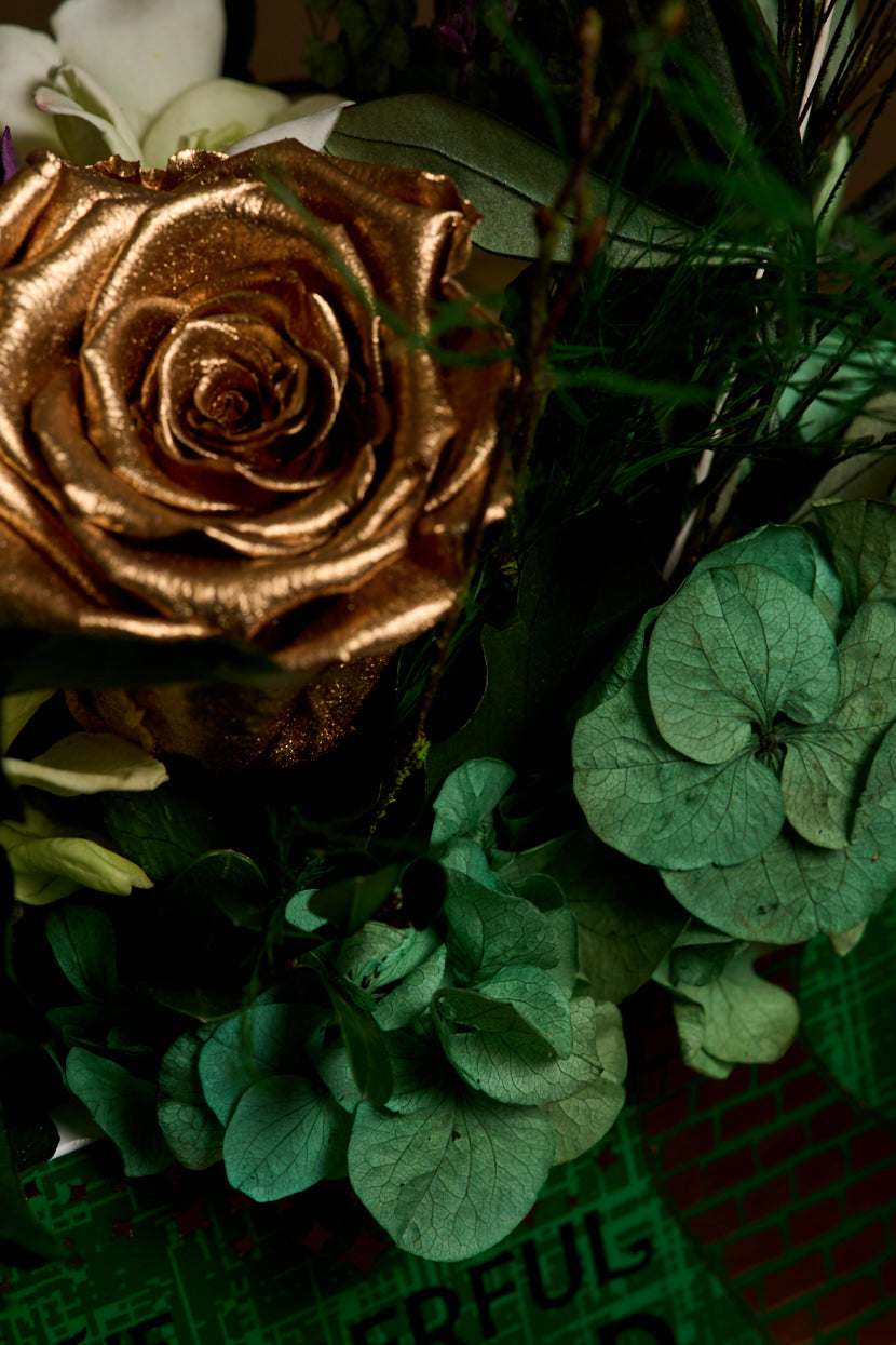 This vibrant composition features lush green hydrangea, a luminous gold rose, a deep purple rose, two green gardenias, a green bi-color rose, cascading green amaranthus, ivy accents, and three striking purple peacock feathers. Every element is a nod to the magic found in unexpected places—the roads we wander, the lessons we gather, and the beauty we find when we dare to believe.