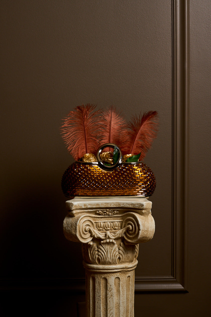 Introducing Tiger — a preserved floral arrangement housed in a beaded amber-toned purse that gleams like sun-warmed whiskey and speaks in glances, not growls.
