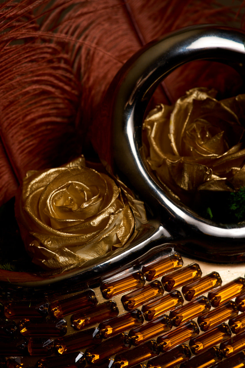 This untamed yet composed composition features three gold roses, rich green moss, and three soft brown feathers. Earthy, glowing, and unapologetically confident, Tiger is a tribute to the kind of strength that doesn’t shout—but always holds the room.