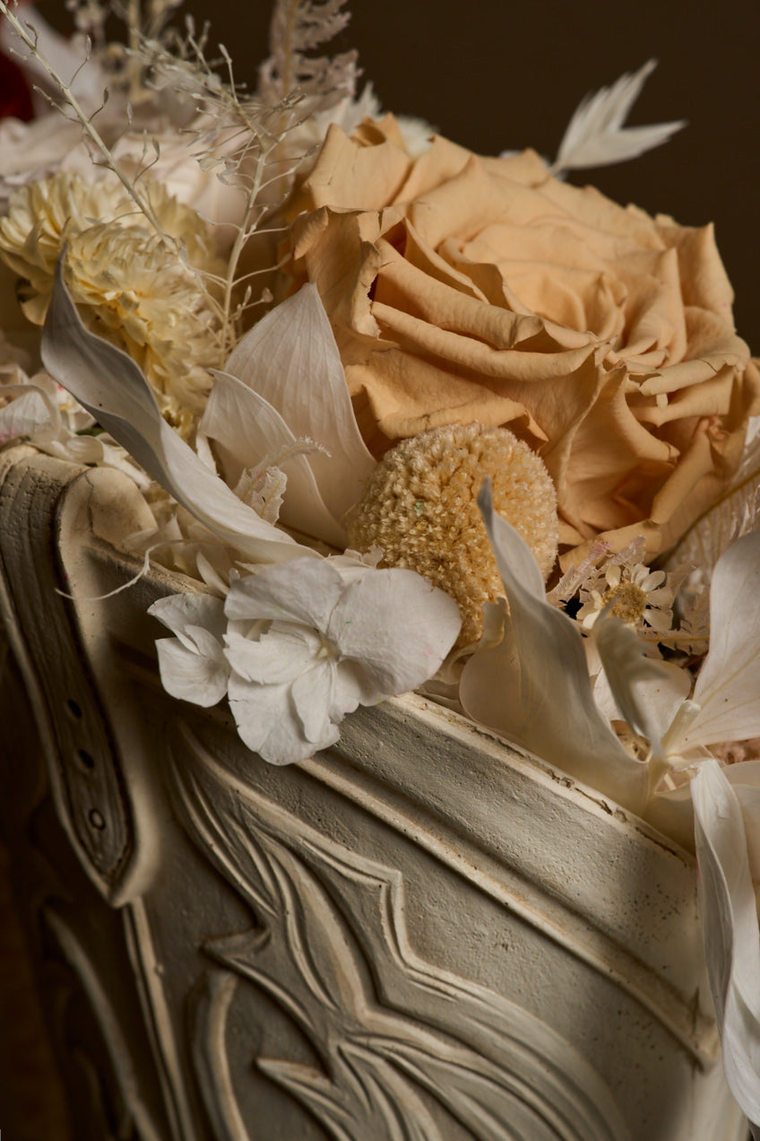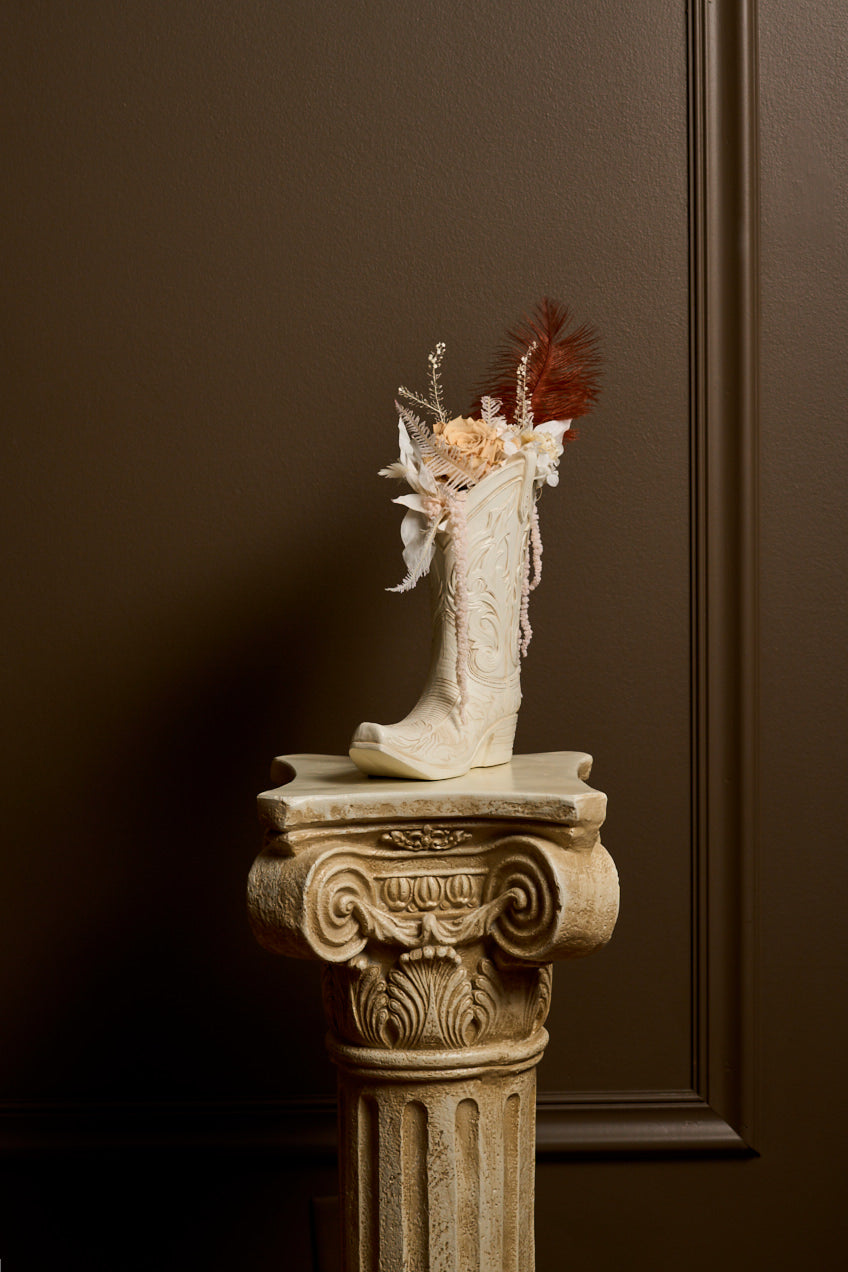 Introducing White Boot — a preserved floral arrangement housed in a white cowboy boot, where tonal beauty meets quiet strength.