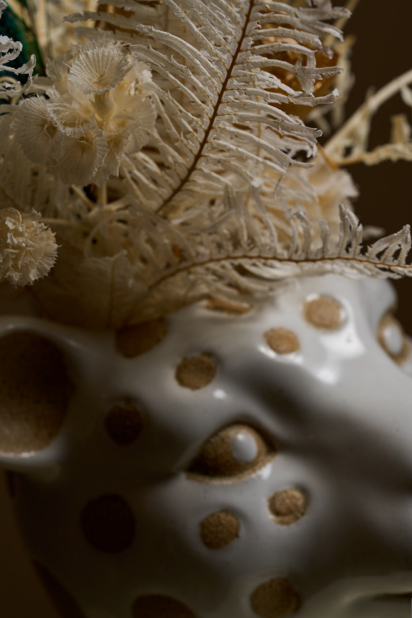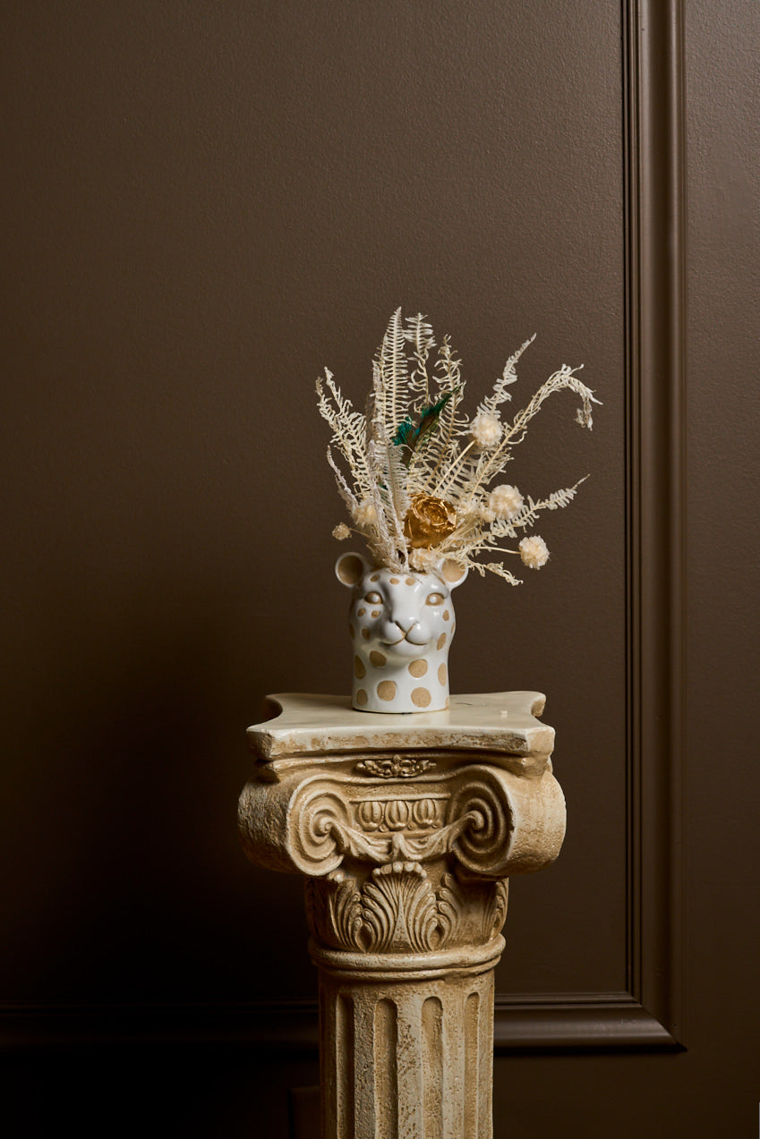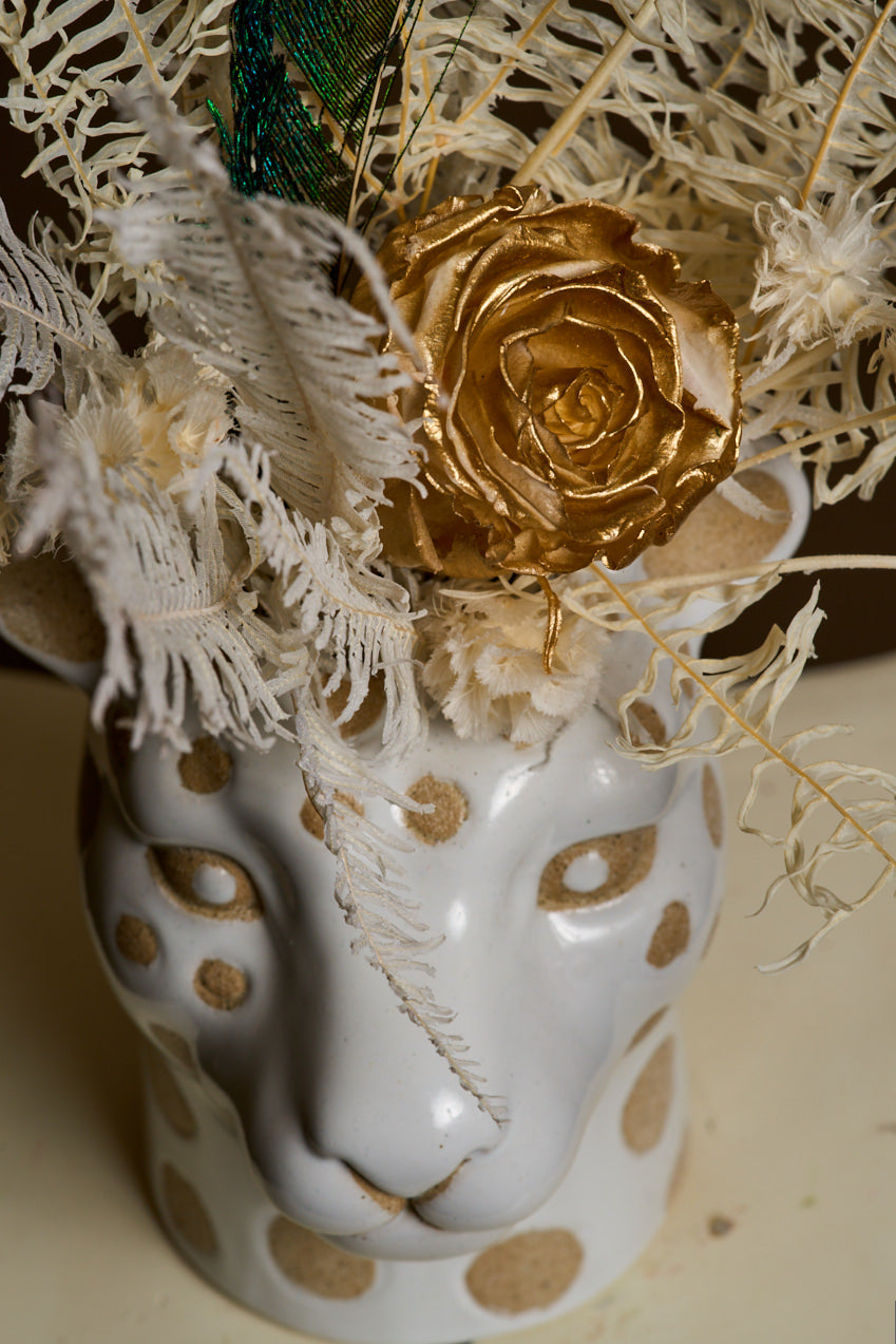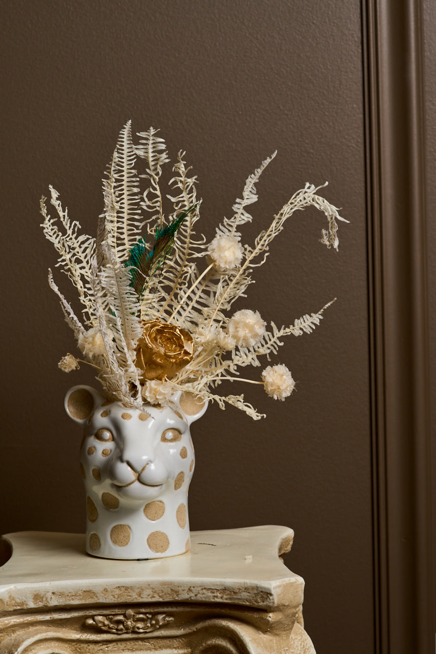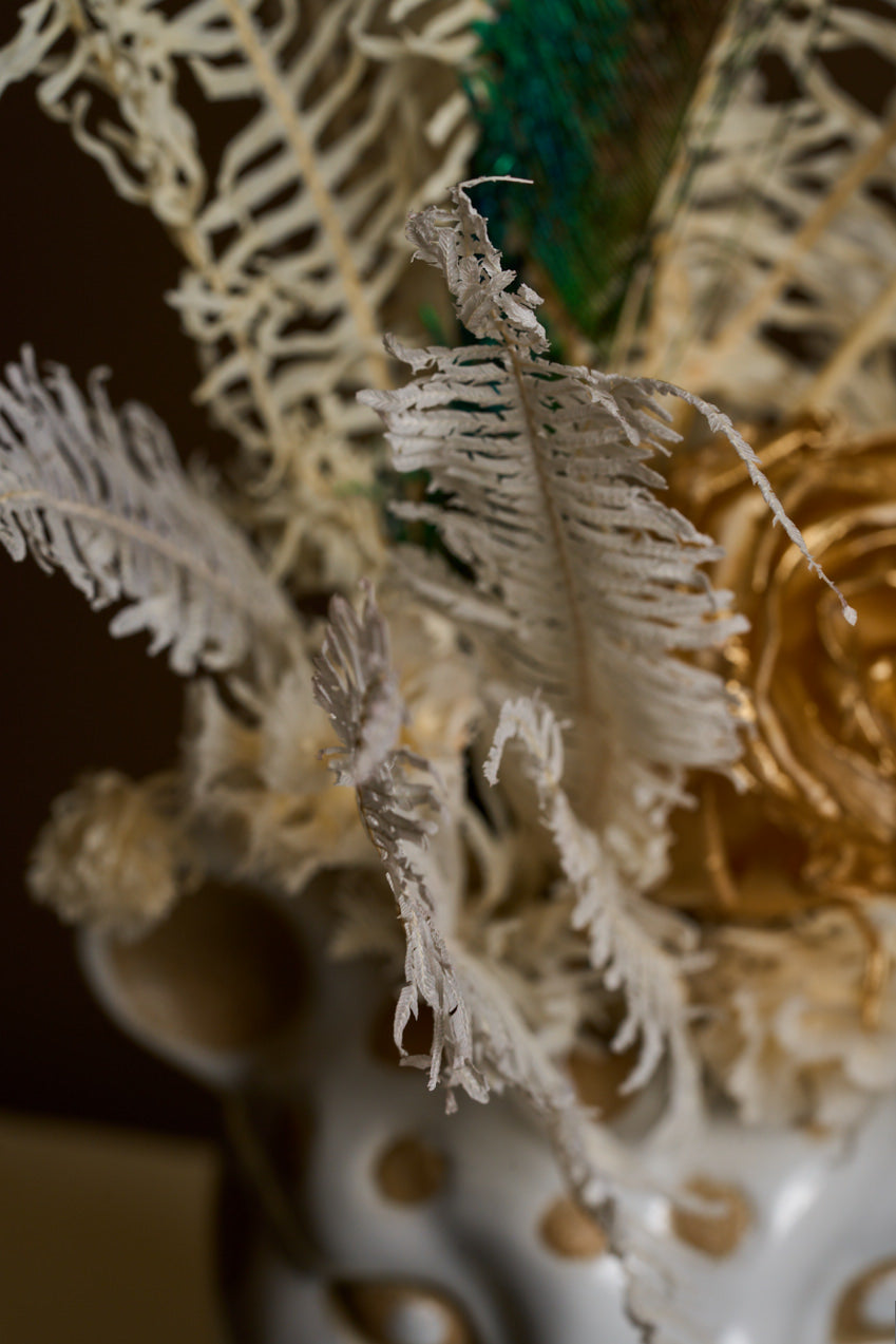 Introducing White Leopard — a striking, minimalist arrangement of white mountain fern and crisp white billy balls, crowned with a single peacock feather like a signature only confidence leaves behind. Cool, composed, and deeply intentional, he’s a study in restraint — the kind that turns heads without trying.