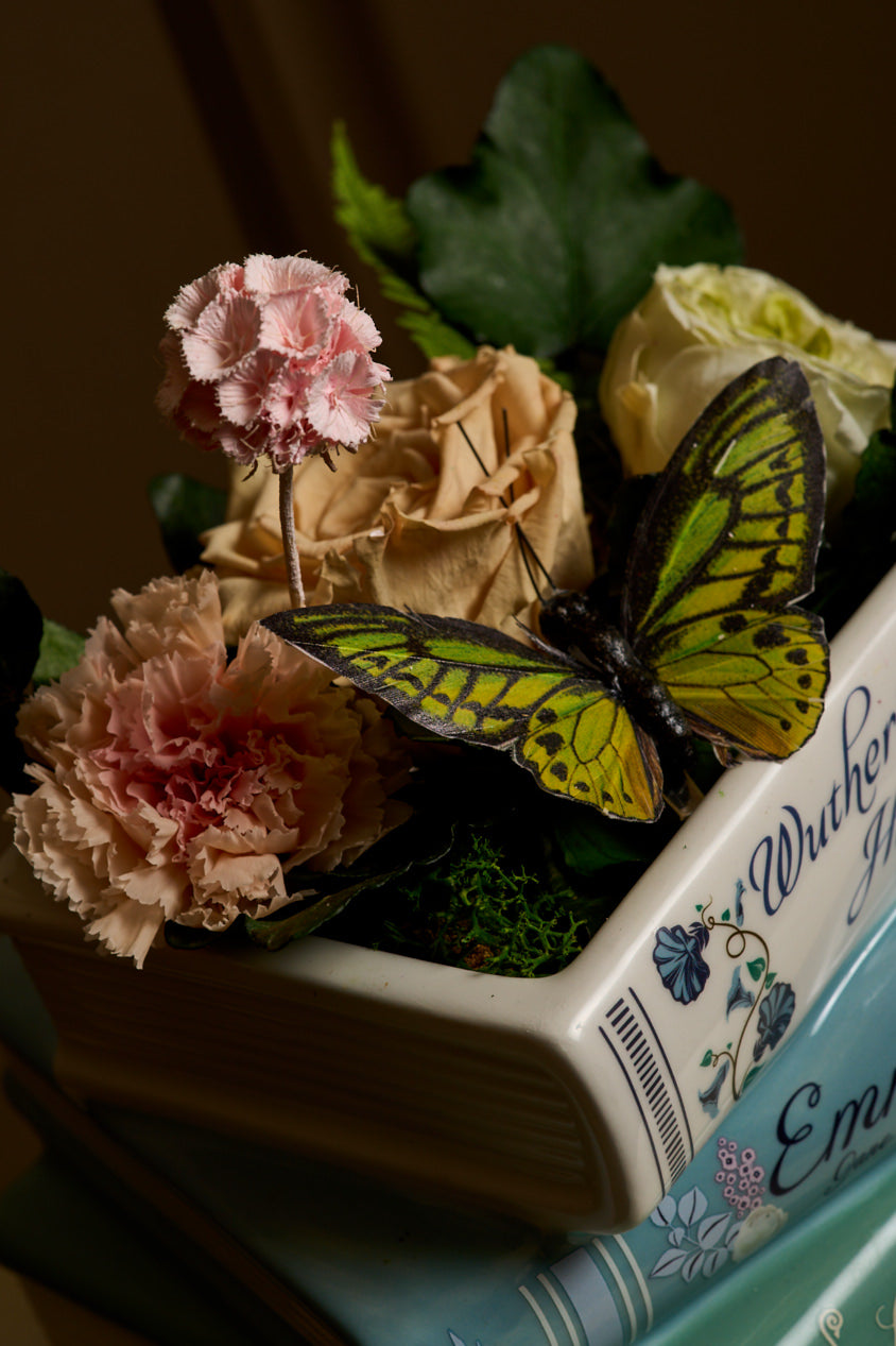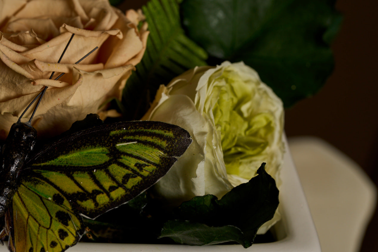 Set in a refined steel planter by Mile and Co., this piece features a green bi-color rose, a soft carnation, a delicate peach rose, trailing ivy, lush moss, a green butterfly, and a bright slice of orange tucked in like a secret. Every element reflects the contrast between wild, untamed emotion and the clever grace of charm—two sides of love, equally unforgettable.